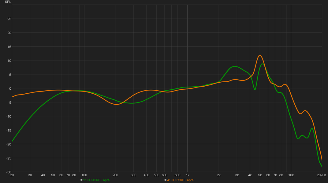 Младшая HD 350BT звучит подобным образом. Различия в графиках ниже частично объяснимы несколько разным положением наушников на измерительном стенде — расположить их абсолютно идентичным образом невозможно. На слух разница также неочевидна и может быть достигнута изменением положения наушников на голове — в частности, для чуть лучшей передачи «глубокого баса» достаточно найти положение, в котором амбушюры максимально плотно прилегают к голове.