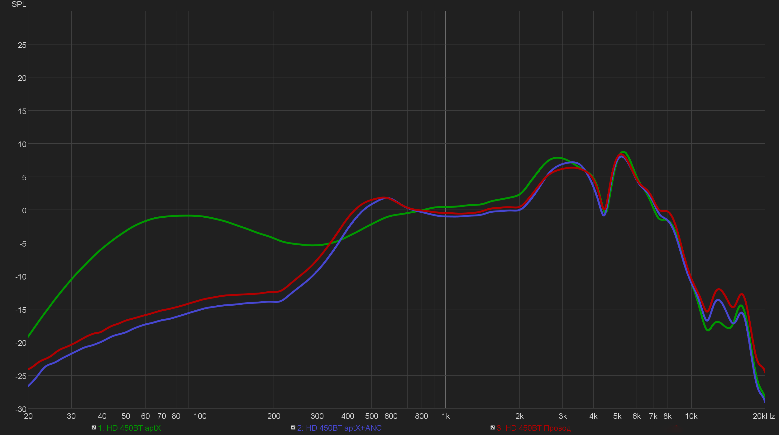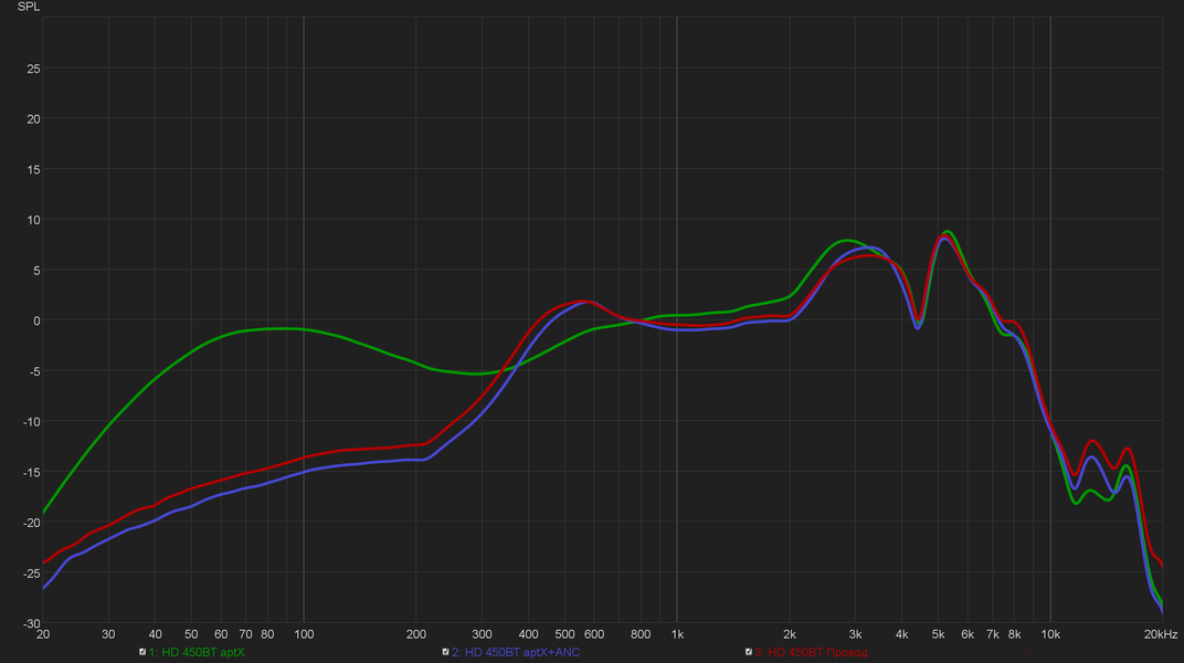 Характер звучания при проводном подключении и активации шумоподавления ощутимо меняется — в частности, снимается акцент на низких частотах. Все измерения на графике ниже проводились без изменения положения наушников на стенде, потому показанные изменения в АЧХ вполне можно считать объективными. В случае проводного подключения они легко объяснимы работой в пассивном режиме с отключенным DSP. Который, по всей видимости, и ответственен за некоторый подъем в НЧ.