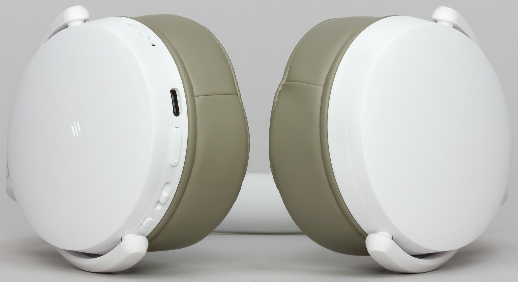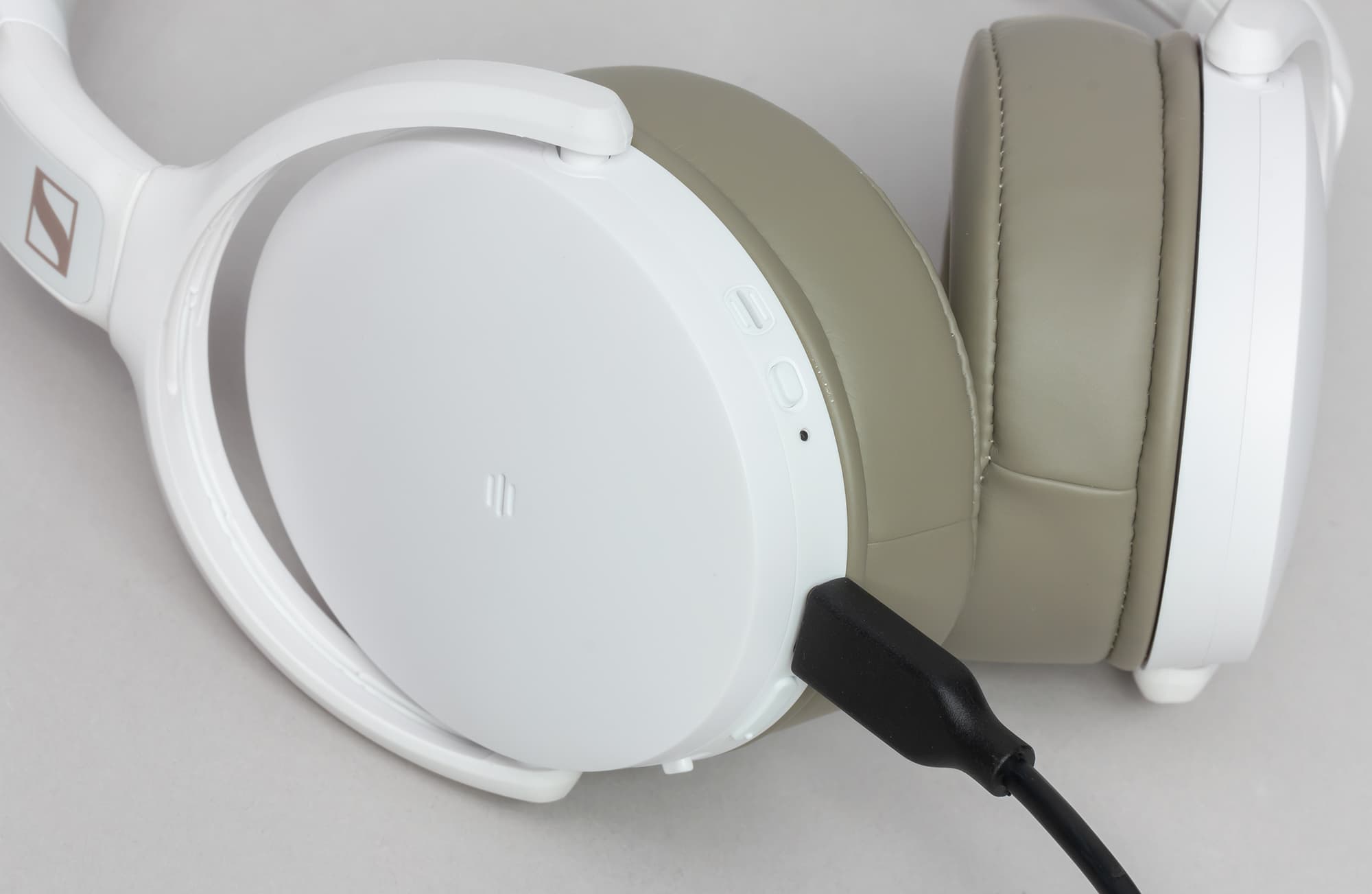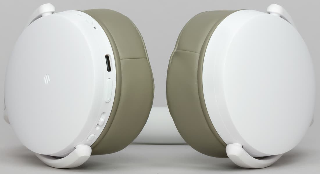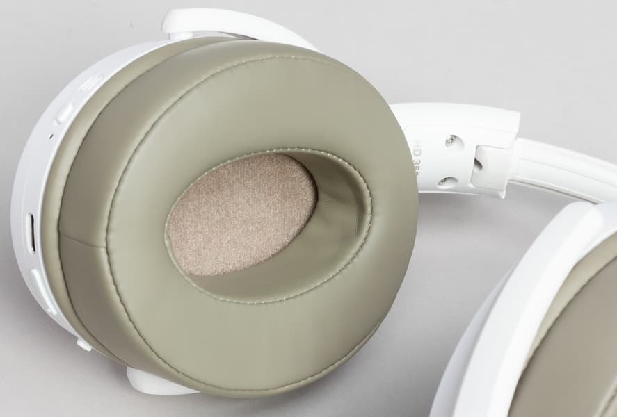 HD 350BT проводное подключение не поддерживает, потому соответствующего разъема у нее нет. Заодно обратим внимание на серый цвет амбушюров. Белые, возможно, смотрелись бы чуть лучше. Зато серые намного практичнее.