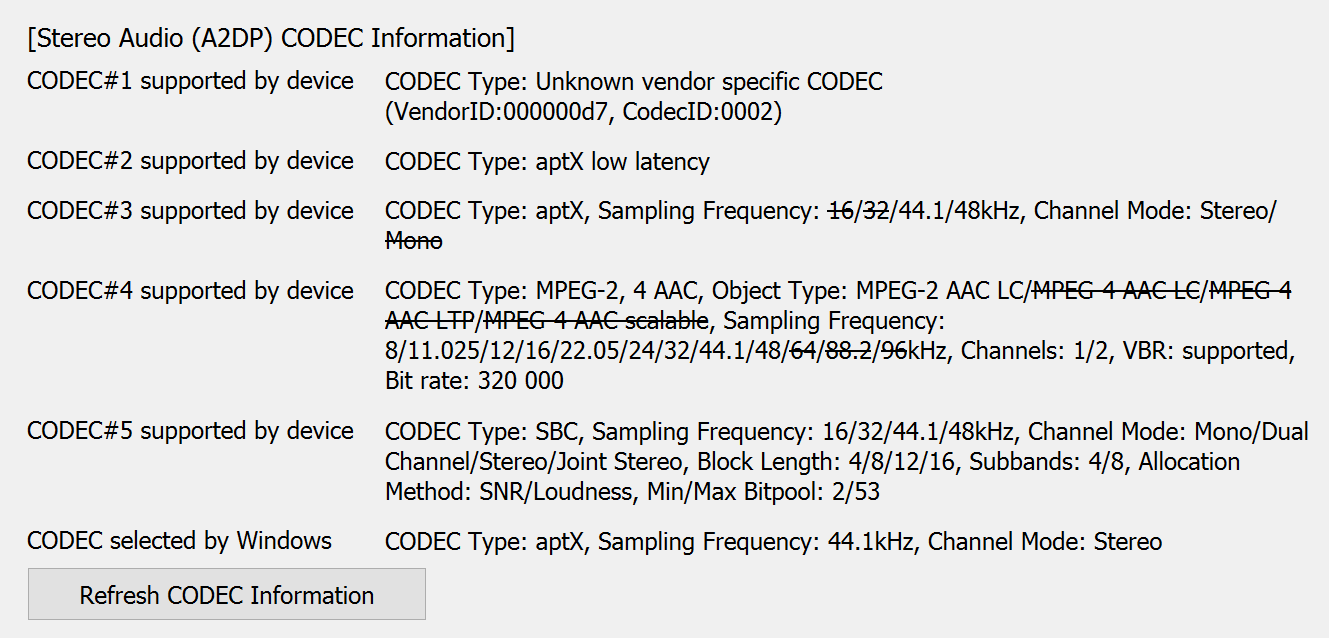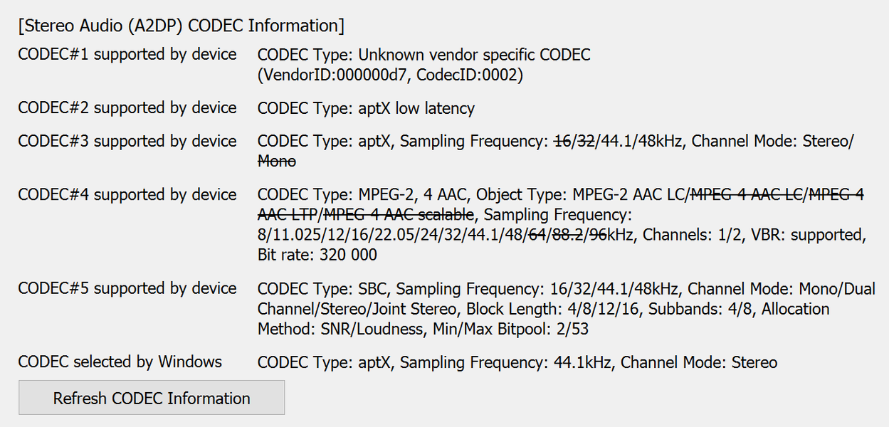 Нет отличий и в списке поддерживаемых кодеков, который мы получили с помощью утилиты Bluetooth Tweaker: SBC, AAC, aptX, aptX LL — все как заявлено. Плюс почему-то еще один кодек с неопределяемым VendorID, идентифицировать который не удалось.
