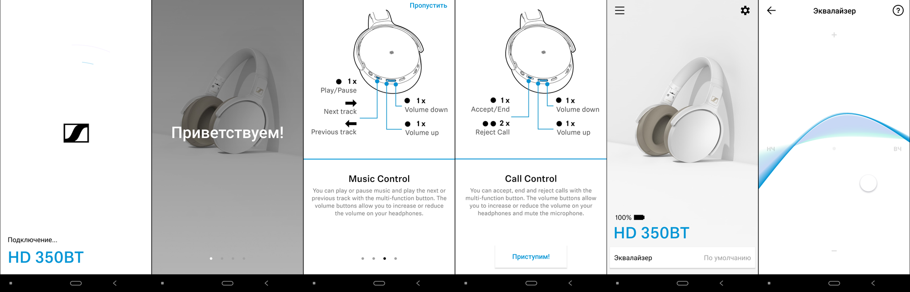 С младшей HD 350BT приложение работает практически так же, единственное отличие — отсутствие упоминания включения системы активного шумоподавления в мини-инструкции на старте.