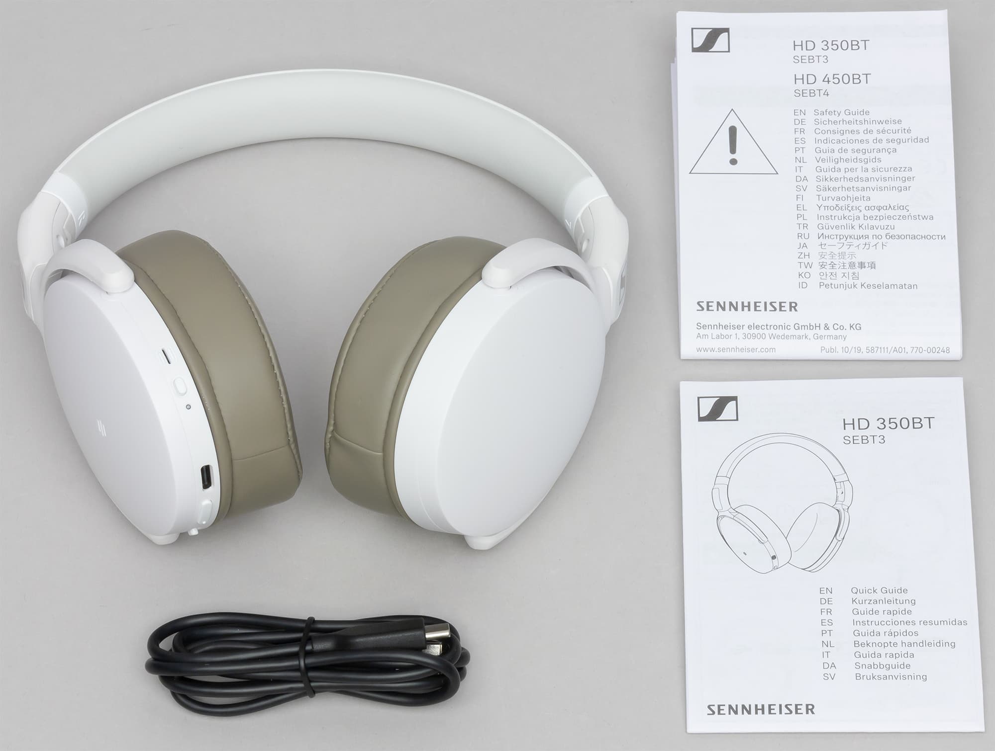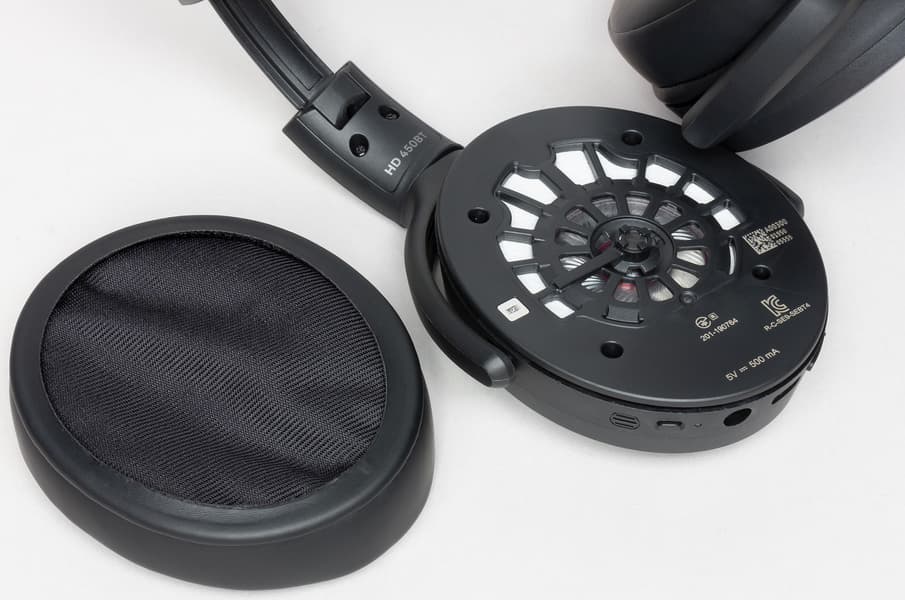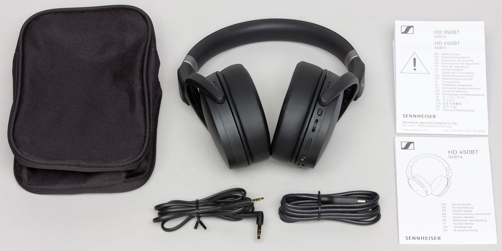 В комплект старшей модели HD 450BT входят сами наушники, аудиокабель для проводного подключения к источнику, кабель для зарядки через USB-C, чехол для переноски и документация.