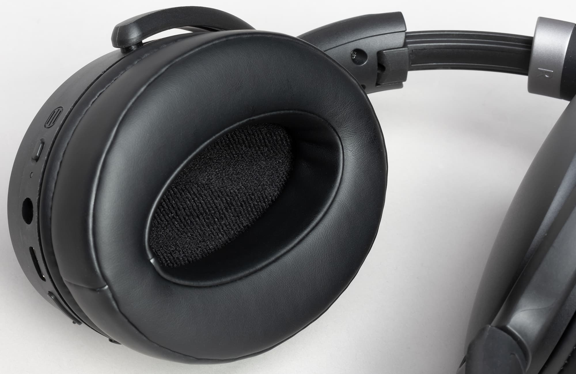 Амбушюры довольно мягкие и глубокие, отверстие динамика прикрыто тканью. На внутренней стороне дуги над выдвижным элементом можно заметить обозначения левого и правого наушника. Но проще ориентироваться по панели управления, которая расположена на правой чашке.
