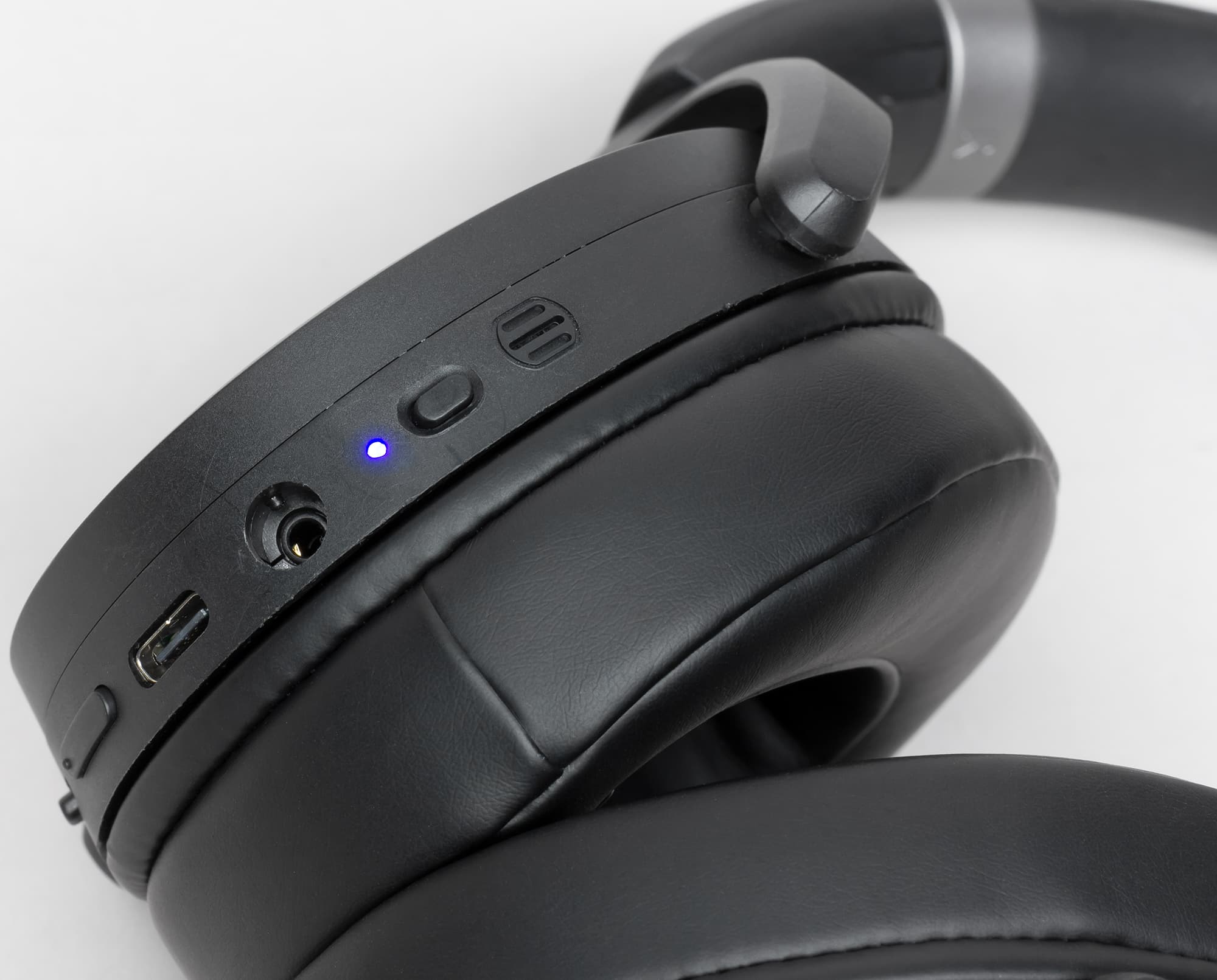 Возле отверстия микрофона расположена кнопка питания, также отвечающая за активацию режима сопряжения и шумоподавления (только у HD 450BT). Далее мы видим качели громкости, а за ними — трехпозиционную клавишу управления воспроизведением. Нажатие на нее ставит музыку на паузу, а перемещение вперед и назад перелистывает треки. Ну и, наконец, добираемся до нововведения — отдельной кнопки активации голосового помощника. Рядом с клавишей питания находится разноцветный светодиодный индикатор, демонстрирующий режимы работы устройства.
