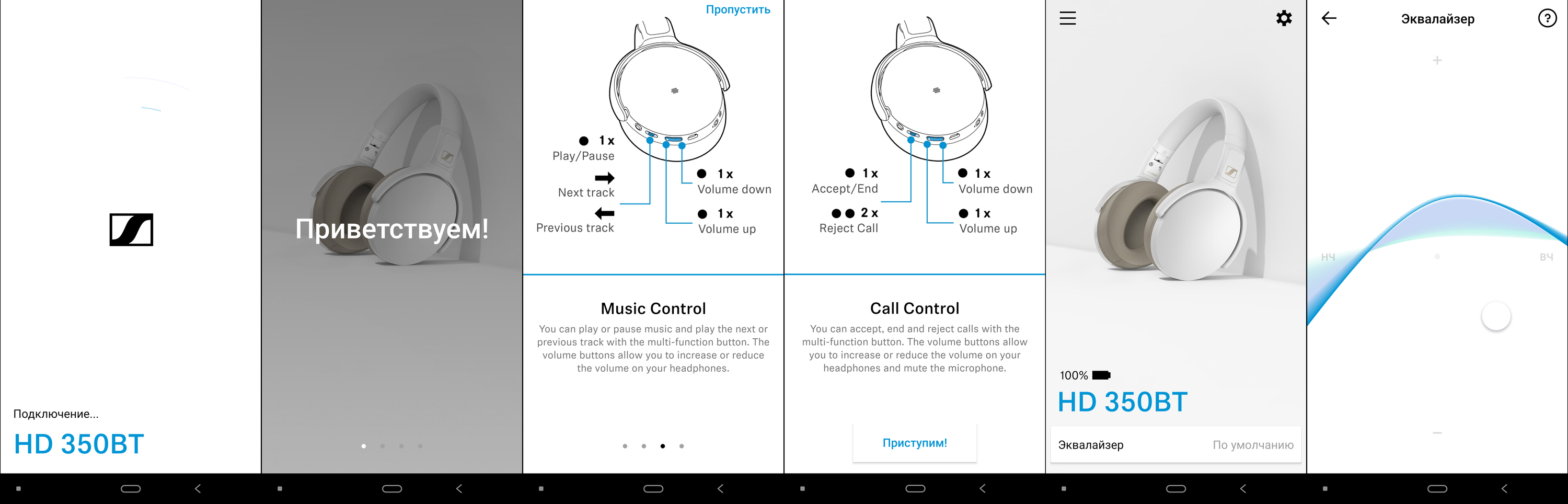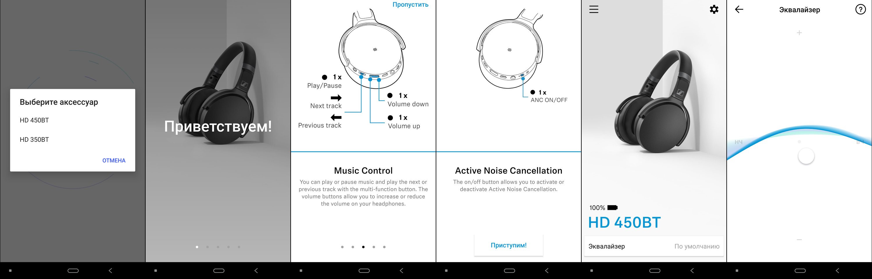 При подключении HD 450BT программа зачем-то уточняет, какую именно гарнитуру мы используем. Далее пользователь видит приветственный экран и небольшую инструкцию по управлению устройством. С помощью приложения можно контролировать уровень зарядки наушников, обновлять их прошивку, а также настраивать звук с помощью фирменного эквалайзера, особенности которого мы обсуждали в упомянутых выше обзорах. Настройки уровня активного шумоподавления как у Momentum 3 Wireless для HD 450BT не предусмотрено, что вполне объяснимо — все-таки более «продвинутая» модель дороже почти в два раза.