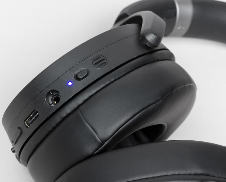 В нижней части правой чашки находятся отверстие микрофона, гнездо для зарядки, разъем миниджек (3,5 мм) для проводного подключения к источнику, светодиодный индикатор, а также кнопки для управления гарнитурой.