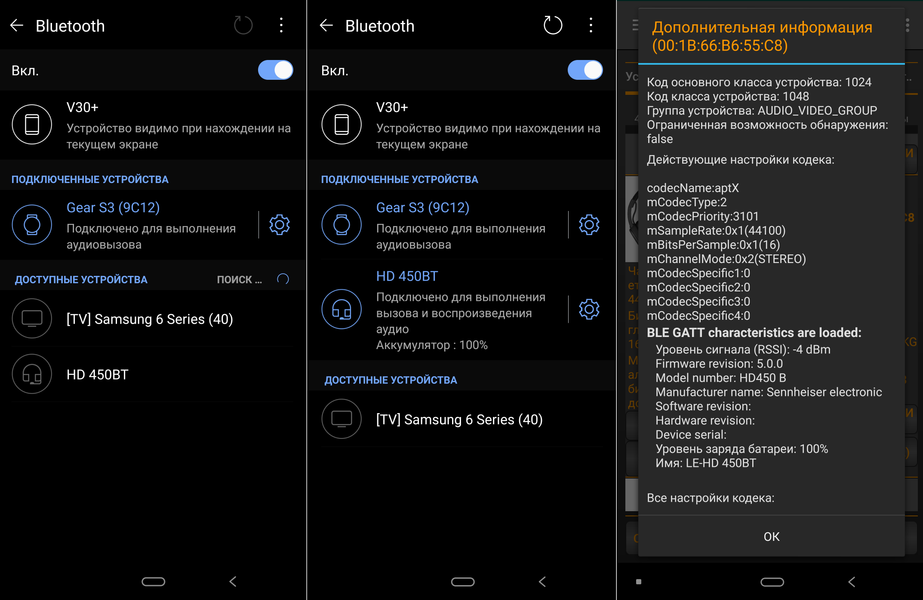 При первом включении наушники автоматически переходят в режим сопряжения с источником, позже его можно активировать длительным нажатием кнопки питания при включении гарнитуры. Далее все просто — находим устройство в соответствующем меню гаджета, подключаем без ввода пароля и прочих сложностей. На всякий случай проверяем, что по умолчанию используется кодек aptX, являющийся одной из «фишек» обоих устройств. На скриншотах ниже показано подключение HD 450BT, в случае младшей модели все происходит абсолютно так же.