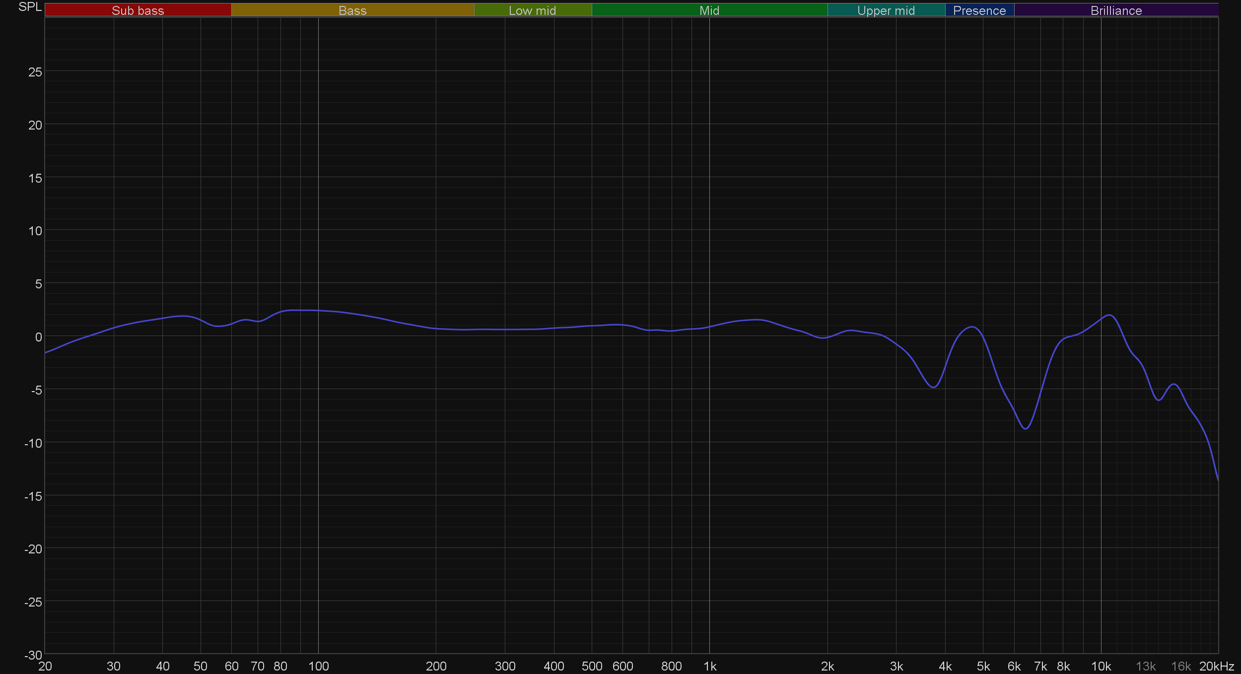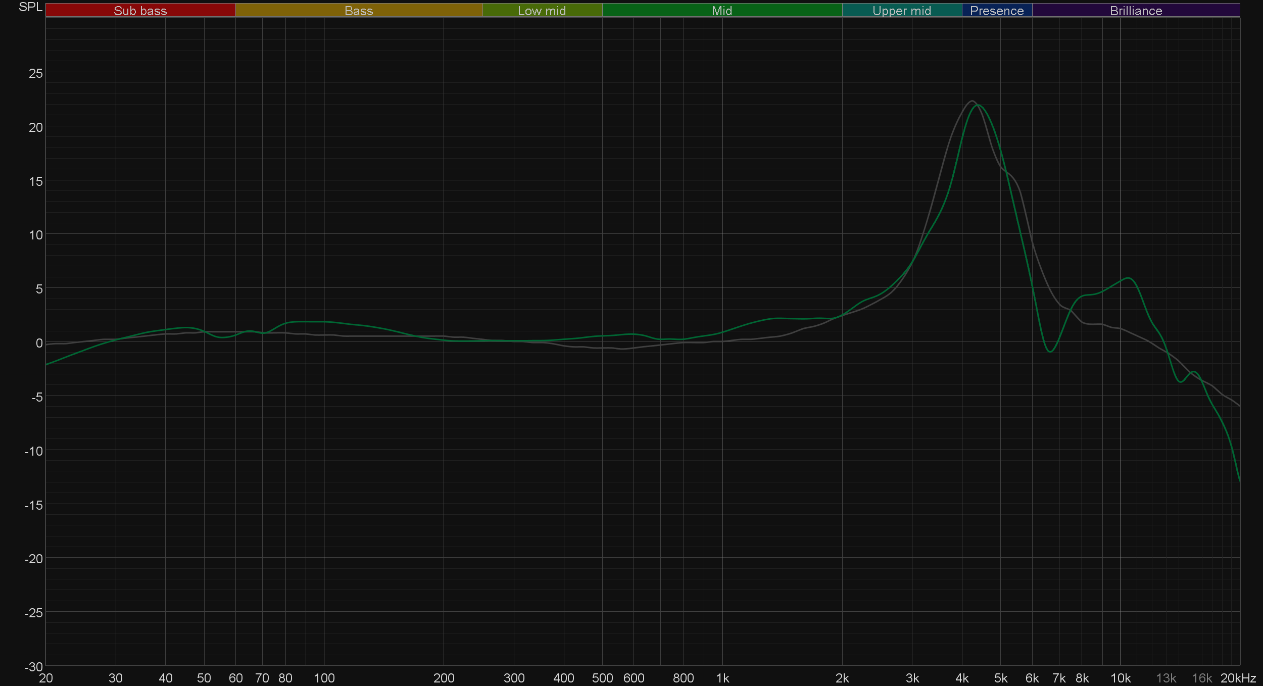 График АЧХ показан на фоне целевой кривой, предоставленной производителем используемого стенда. Она является адаптированным под конкретное устройство аналогом так называемой «кривой Хармана», созданной командой Harman International под руководством доктора Шона Олива. Люди неодинаково воспринимают звук разной частоты, поэтому даже самые точные измерения могут не соответствовать реальному пользовательскому опыту. Для компенсации этих различий и используется целевая АЧХ. Близкое к ней звучание оценивалось сотнями участников экспериментов как нейтральное, сбалансированное, естественное и так далее.