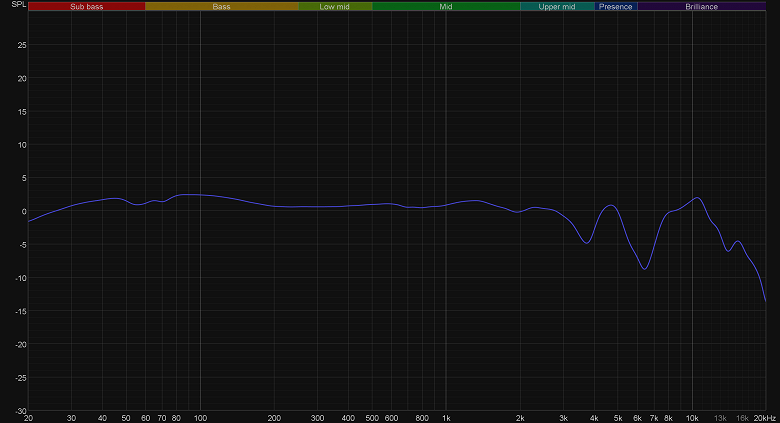 Детализация средних частот находится на отличном уровне, вокал и партии солирующих инструментов звучат полновесно и ярко, но при этом остаются вполне «в кассе», не нарушая общего баланса микса. Всяческих похвал достойна и передача ВЧ-регистра. Он очень хорошо артикулирован, нет проблем с сибилянтами, звук высоких тарелок не режет ухо — в общем, любители комфортного прослушивания музыки точно оценят. В качестве иллюстрации, как всегда, приведем график АЧХ.