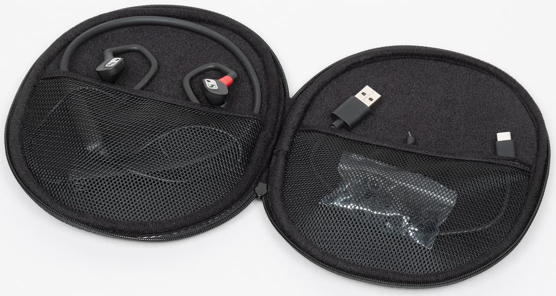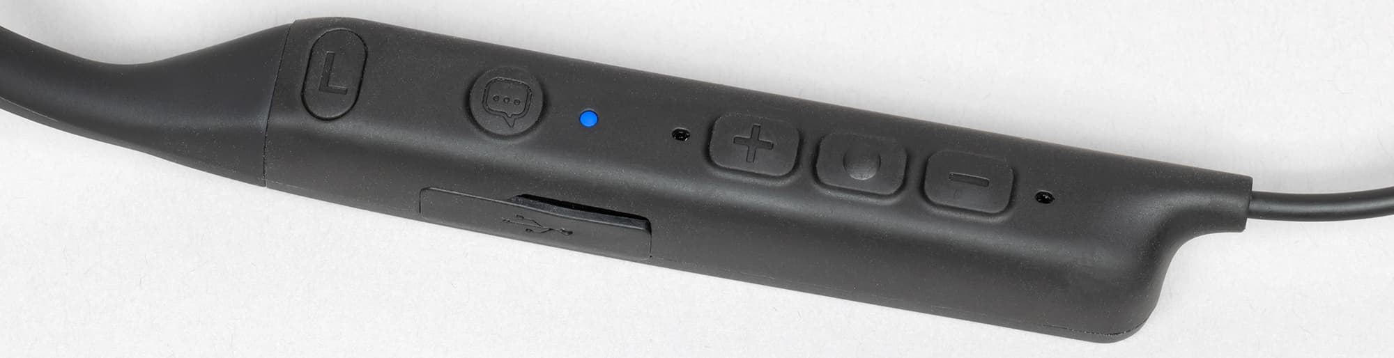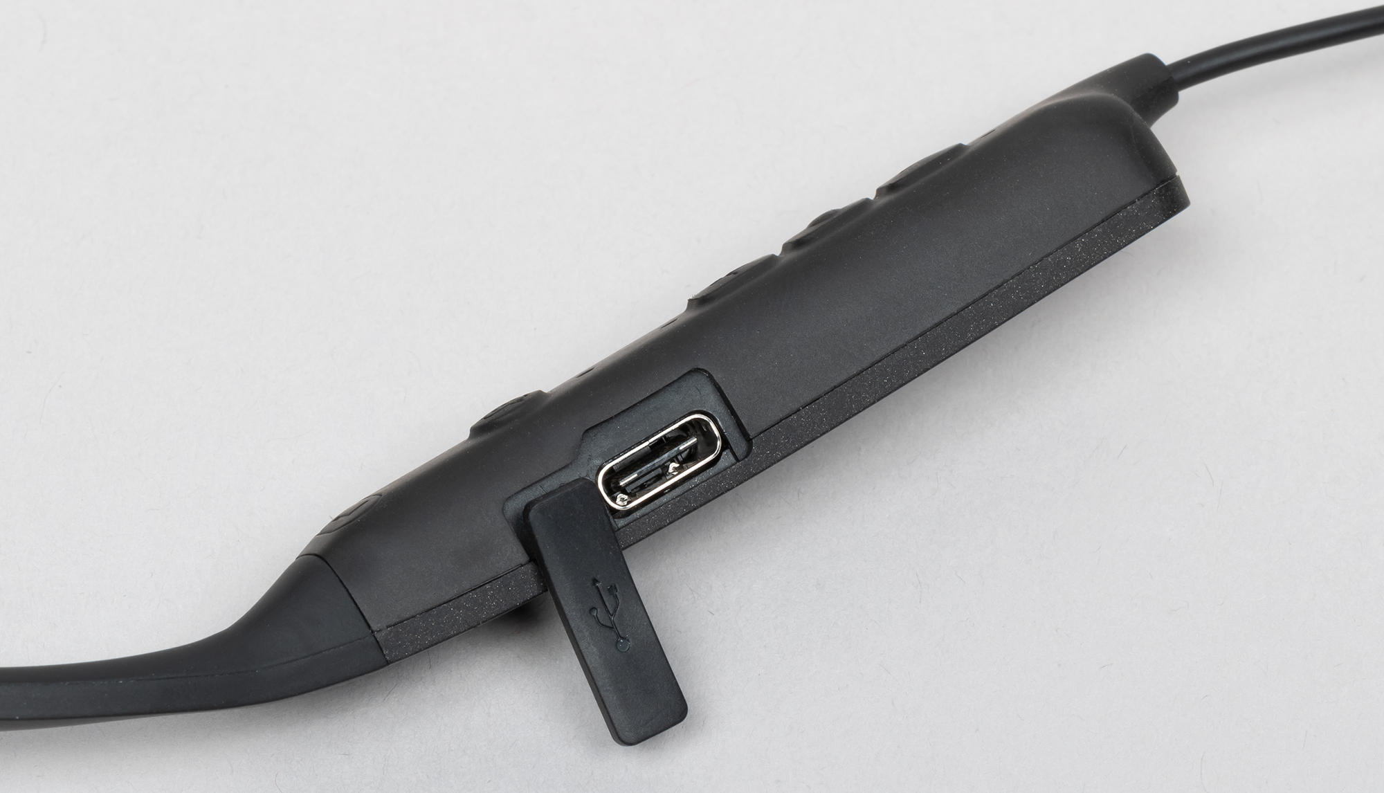 Заявленного класса водозащиты нет, но порт для зарядки прикрыт заглушкой, кнопки полностью закрыты силиконом и не имеют зазоров с корпусом… В общем, есть все основания полагать, что брызги дождя и капли пота наушники «переживут» легко. А значит, их вполне можно использовать для спорта. Во время пробежки чуть более тяжелые нижние части шейного обода обеспечивают ему достаточную стабильность, а эргономичная форма внутренней части корпуса и широкий выбор амбушюров позволяют добиться надежного и комфортного наушников в ухе. Плюс заушные крепления точно не дадут им выпасть. При активных занятиях нижние части обода «подпрыгивают», при скручиваниях на наклонной скамье гарнитура пытается упасть и часто удерживается лишь за счет креплений на ушах. Но тут уж ничего не поделаешь — издержки форм-фактора.