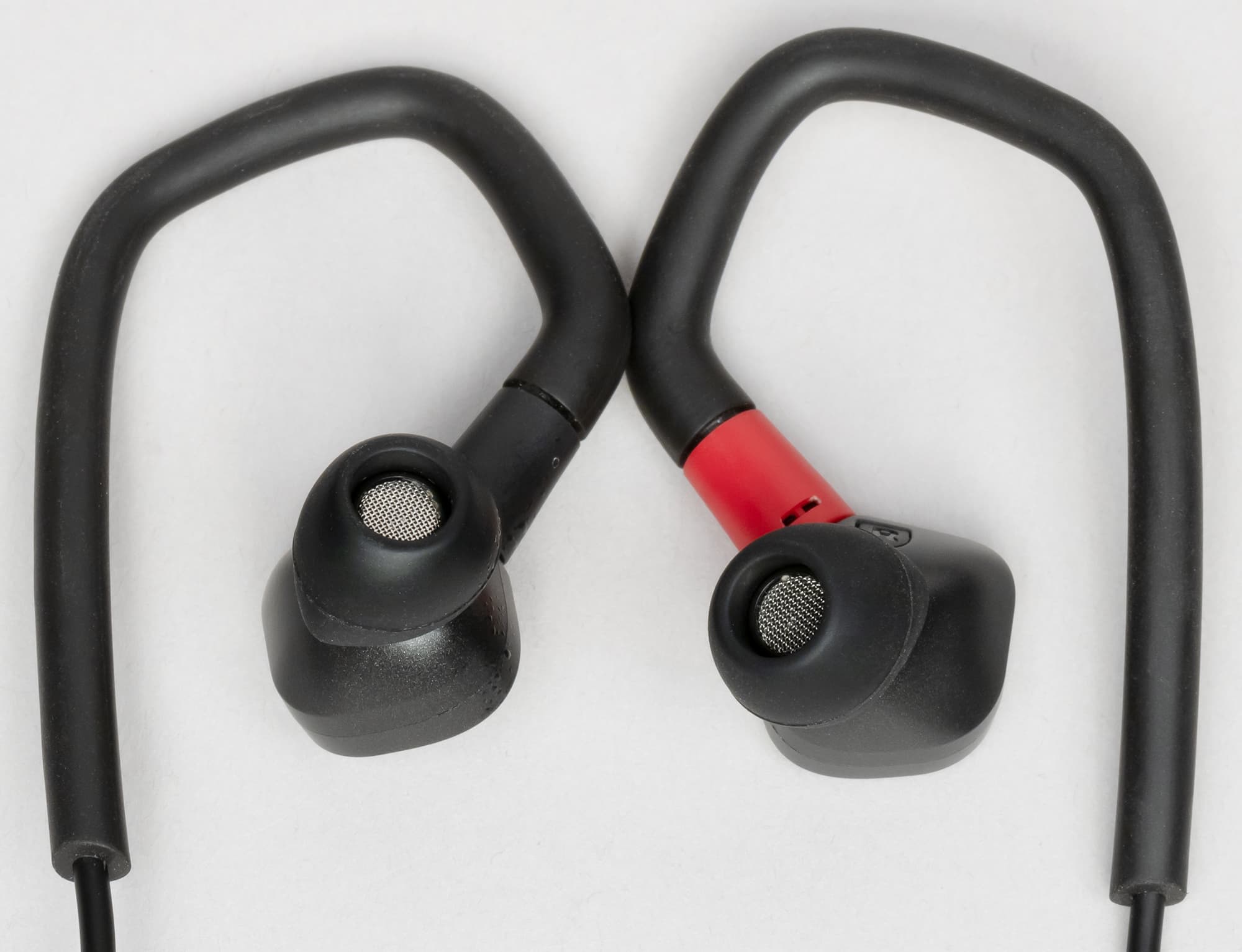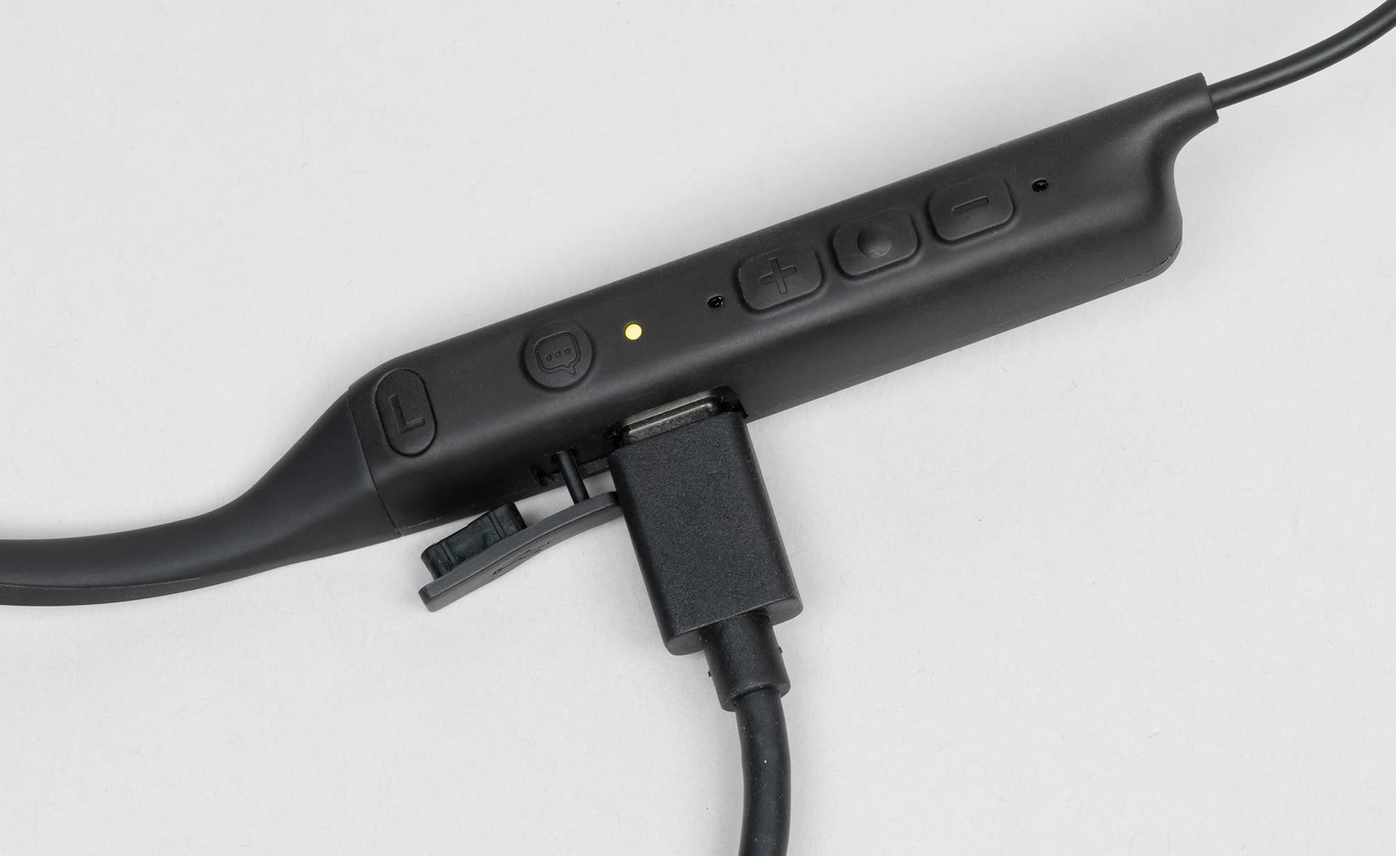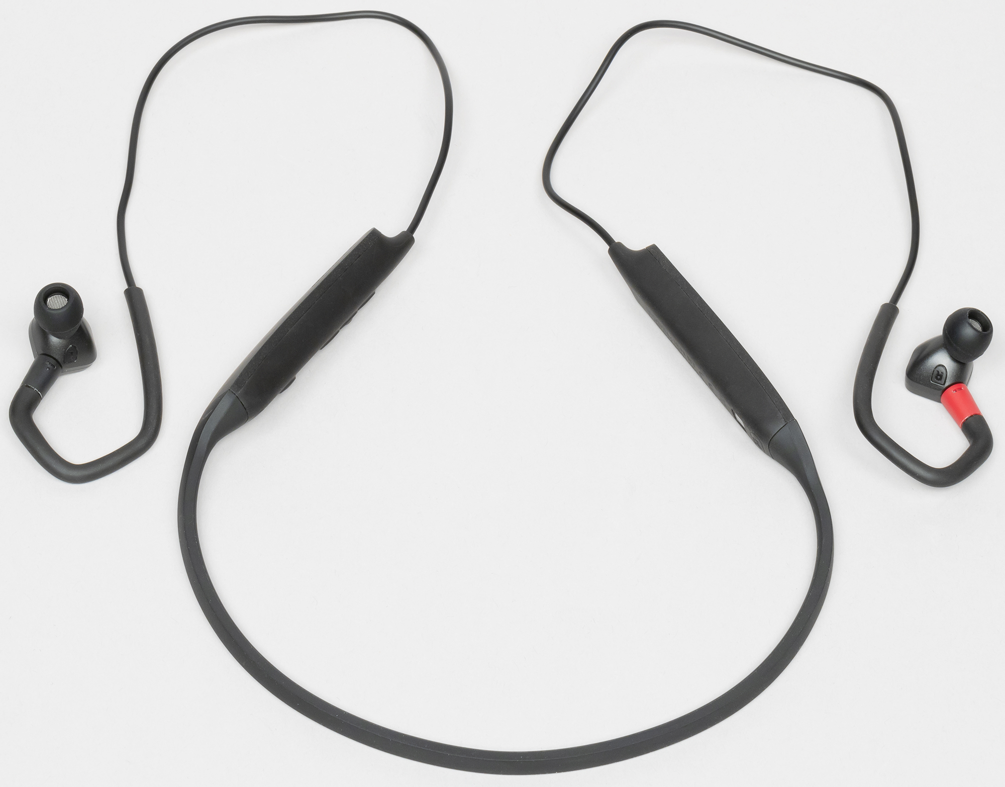 Заявленного класса водозащиты нет, но порт для зарядки прикрыт заглушкой, кнопки полностью закрыты силиконом и не имеют зазоров с корпусом… В общем, есть все основания полагать, что брызги дождя и капли пота наушники «переживут» легко. А значит, их вполне можно использовать для спорта. Во время пробежки чуть более тяжелые нижние части шейного обода обеспечивают ему достаточную стабильность, а эргономичная форма внутренней части корпуса и широкий выбор амбушюров позволяют добиться надежного и комфортного наушников в ухе. Плюс заушные крепления точно не дадут им выпасть. При активных занятиях нижние части обода «подпрыгивают», при скручиваниях на наклонной скамье гарнитура пытается упасть и часто удерживается лишь за счет креплений на ушах. Но тут уж ничего не поделаешь — издержки форм-фактора.