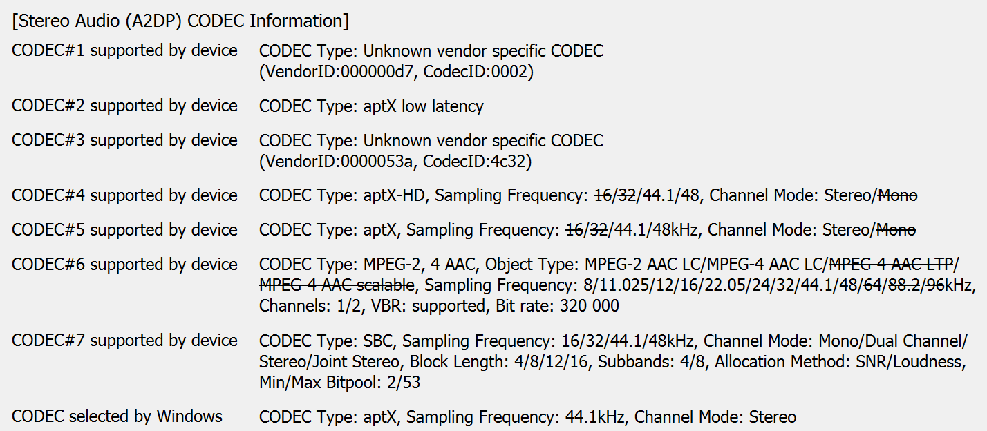 Как уже говорилось чуть выше, набор кодеков у IE 80S BT впечатляющий, есть и весьма востребованный любителями качественного звука aptX HD. Среди кодеков, которые используемая утилита не смогла «опознать», вероятнее всего, присутствует заявленный в спецификациях HWA HD — сравнительно новый кодек от Huawei, поддерживающий битрейт до 900 кбит/с и максимальные параметры потока 24 бита/96 кГц.