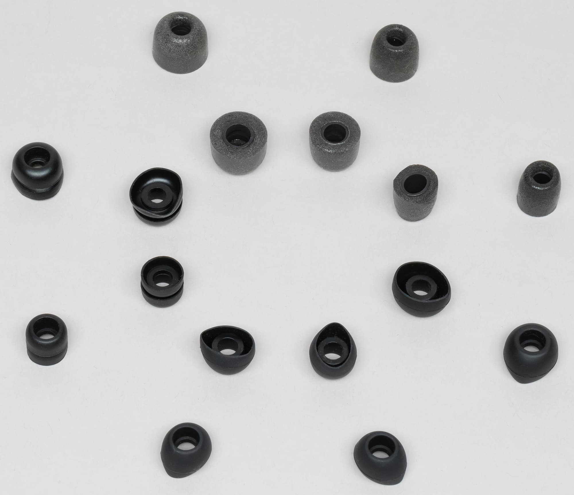 Амбушюры представлены трех типов — одноконтурные и двухконтурные силиконовые, плюс пенные. Каждого типа — по три размера, подобрать что-то для себя сможет практически любой слушатель.