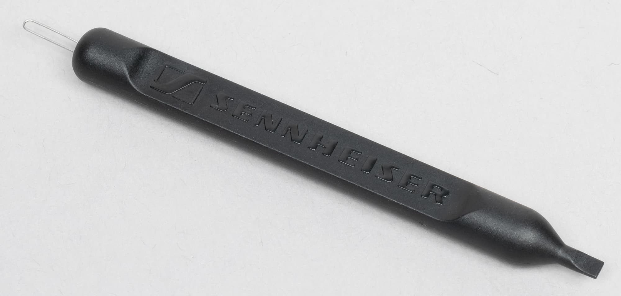Также в комплект входит инструмент, небольшая металлическая петля на одном конце которого служит для очистки наушников, а отвертка на другом — для вращения регулятора баса.