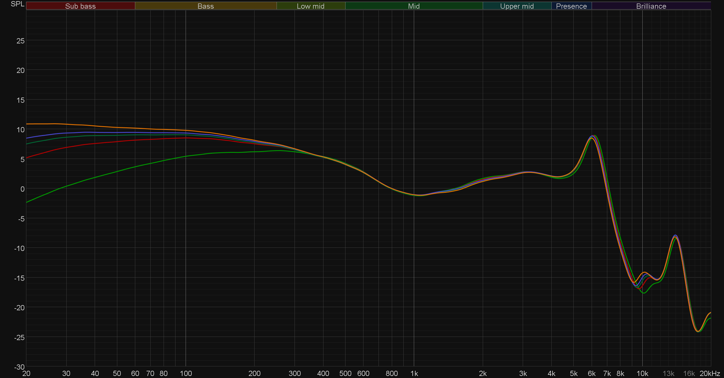 Учитывая возможность настройки уровня низких частот не только с помощью программного эквалайзера, но и посредством вращения регуляторов на внешней стороне корпуса наушников, при подборе амбушюров есть смысл больше ориентироваться на комфорт посадки и уровень пассивной шумоизоляции. Ниже представлены графики АЧХ в пяти различных положениях регулятора НЧ, соответствующих отметкам на корпусе. Как можно заметить, перемещение регулятора до первого уровня дает примерно половину от возможного прироста, а вот дальше он начинает работать более деликатно.