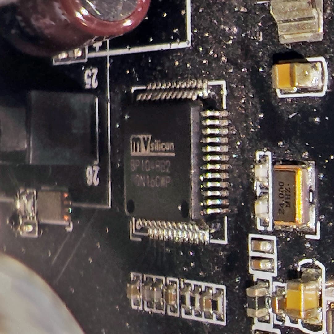 Чип в нижней левой части скромно прикрыт черной наклейкой. Снимем ее, чтобы посмотреть, что же там под ней интересного. А под ней — MVSIlicon BP1048B2, ответственный за Bluetooth-подключение. Чип нам хорошо знаком, причем по бюджетным продуктам — прямо скажем, это далеко не самое «продвинутое» решение на рынке. Немного досадно, но для рассматриваемого плеера Bluetooth — скорее, дополнительная опция, которая будет использоваться периодически для каких-нибудь подкастов или фоновой музыки, а то и не будет использоваться вовсе.