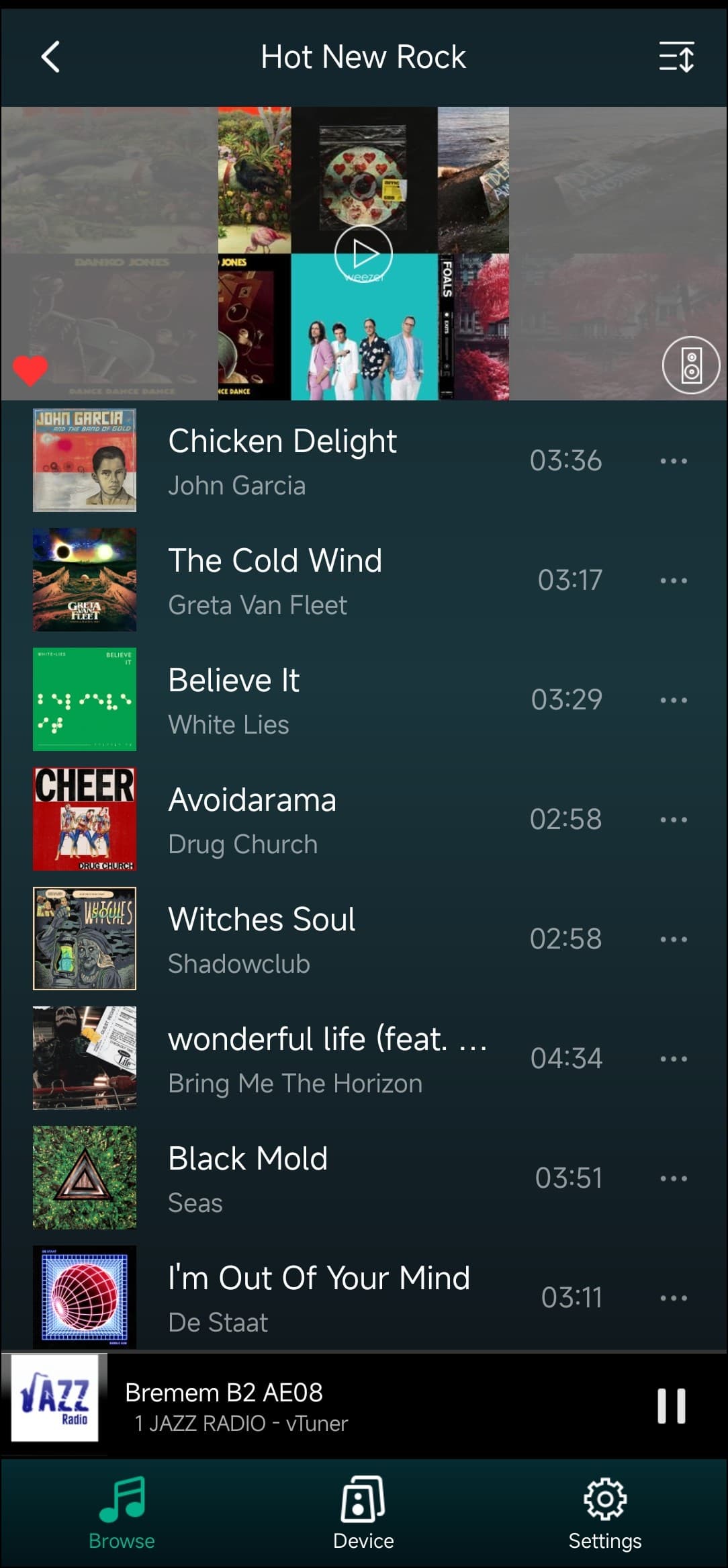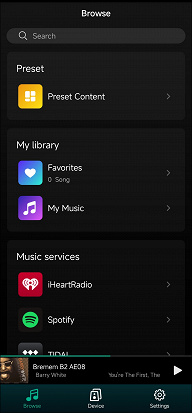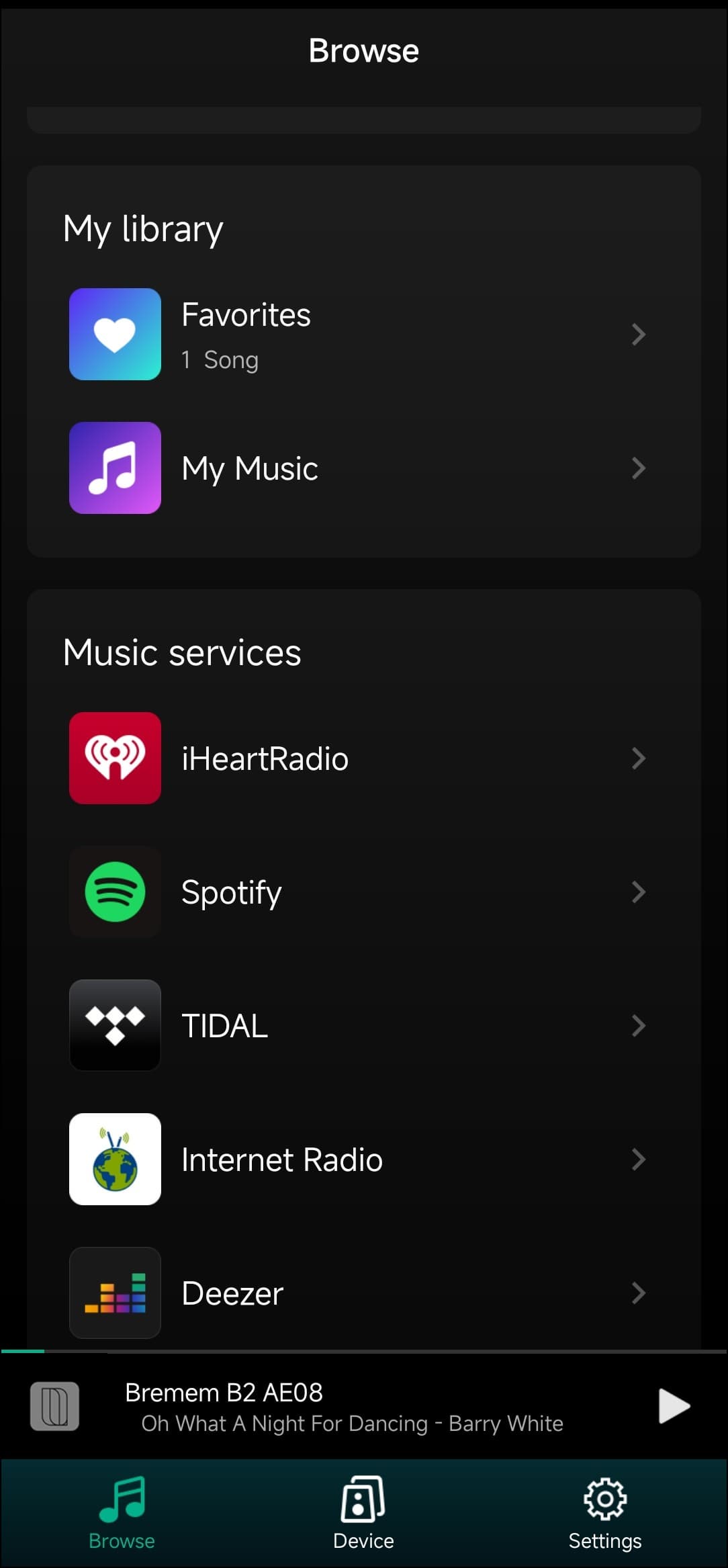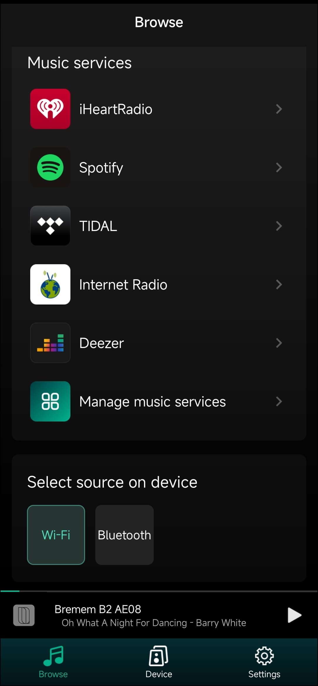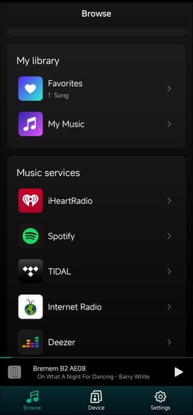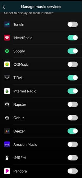 Любую композицию можно добавить в список любимых для быстрого доступа — удобно. Но нас, конечно, в первую очередь интересуют стриминговые сервисы. Их тут немало, ненужные есть возможность отключить. На третьем скриншоте видны кнопки переключения между сетевым и Bluetooth-подключением, о котором мы говорили чуть выше.