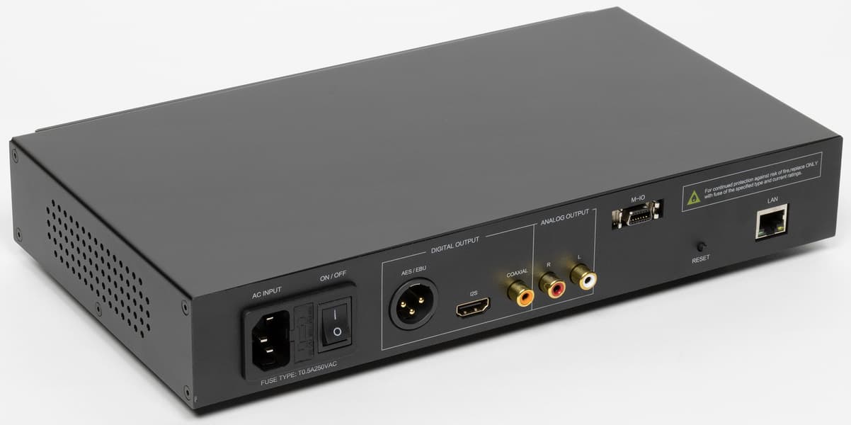 Основная часть портов для подключения плеера размещена на задней панели. Слева мы видим разъем для подключения питания и клавишу включения/выключения. Далее находится блок с цифровыми выходами: разъемом XLR для подключения посредством AES/EBU, а также использующий I2S порт HDMI. Ну и, наконец, третий вариант цифрового подключения — коаксиальный выход S/PDIF.