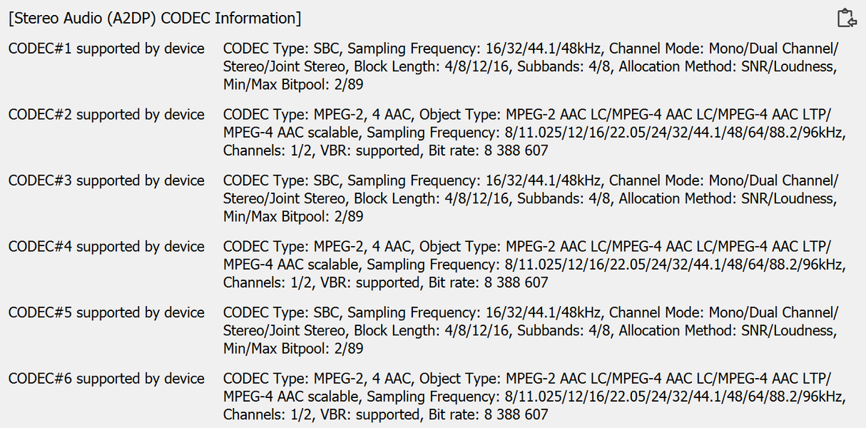 Кодека всего два — SBC и AAC, что не стало сюрпризом, учитывая увиденный выше чип BP1048B2. Bluetooth-подключение явно рассчитано на фоновую музыку и подкасты, их возможностей должно хватить. Но все же было бы здорово увидеть какой-нибудь aptX, например.