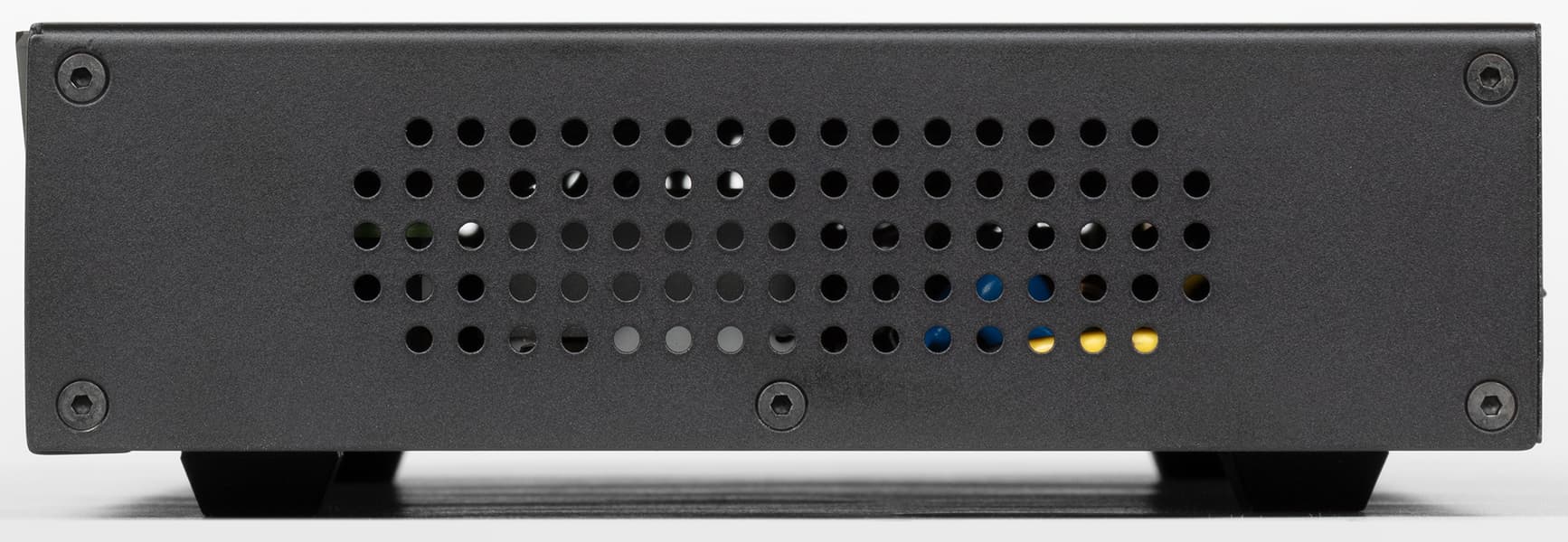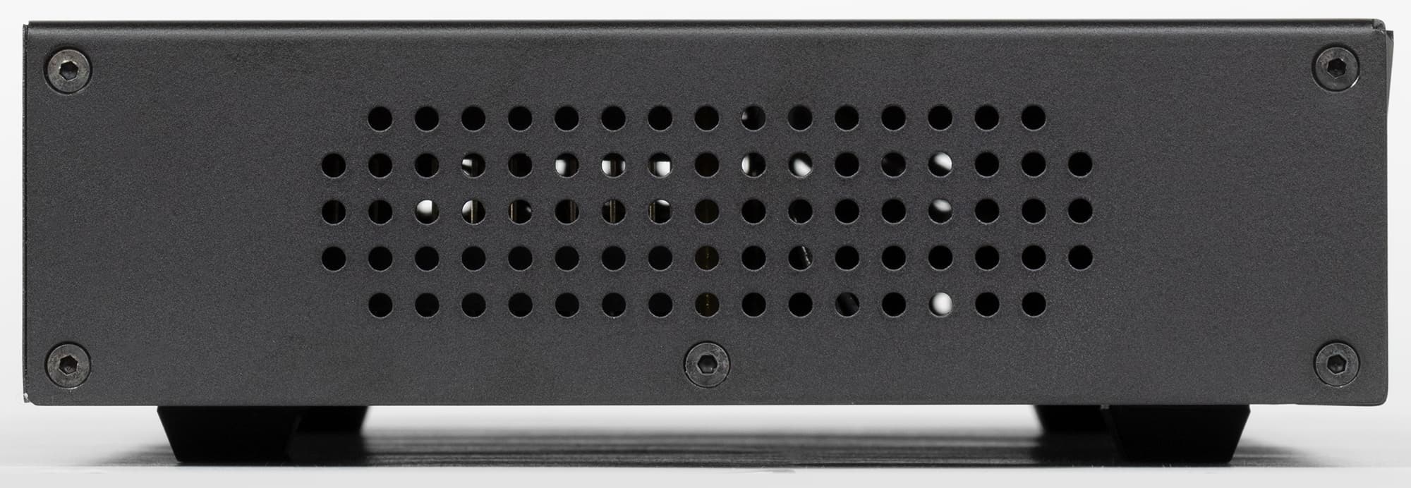 На боковых стенках размещены крупные вентиляционные отверстия, через которые видны внутренности устройства.
