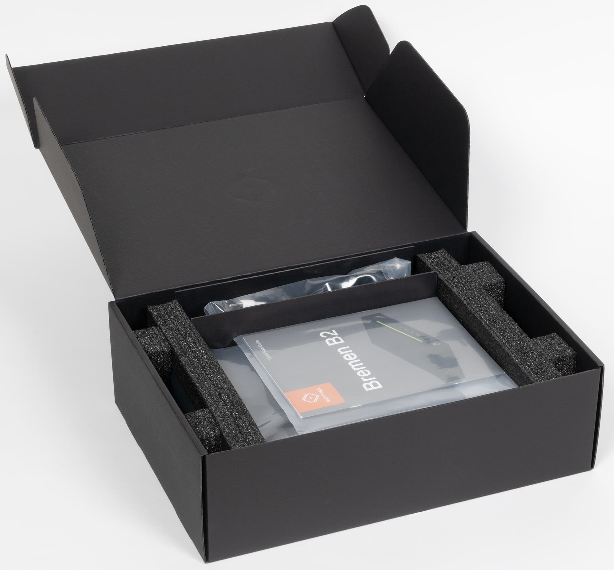 Внутри коробки устройство надежно закреплено с помощью ложемента из пенистого материала, все элементы комплекта помещены в отдельные пластиковые пакеты.