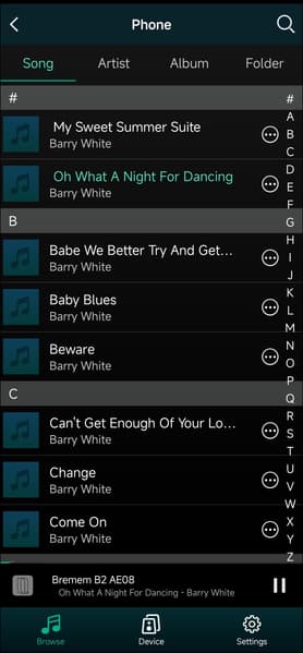 Bluetooth-подключение задействуется из приложения — ниже мы увидим соответствующую кнопку. Далее все как обычно: поначалу плеер ищет «знакомые» устройства, если не находит — активирует режим сопряжения. Остается найти его в соответствующем меню мобильного устройства и подключить. Мультипойнт не поддерживается, полный список доступных кодеков и их режимов мы традиционно получили с помощью утилиты Bluetooth Tweaker.