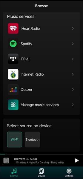 Сразу отметим, что плеер не поддерживает Wi-Fi 5 ГГц, что тоже немного странно и досадно — от современного устройства мы такого не ожидали. У нас за все время тестирования при подключении к сети 2,4 ГГц проблем не возникло, но теоретически они вполне возможны, так что проводное подключение может пригодиться. Ну и в целом оно стабильнее и надежнее, подвести Ethernet-кабель к стойке с аудиоаппаратурой — не самая плохая идея.
