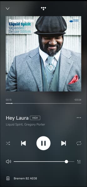 Мы для примера авторизовались в Tidal. Все прекрасно работает, плеер сообщает о том, что качество воспроизведения High — то есть высокое.