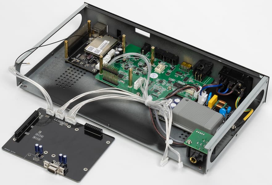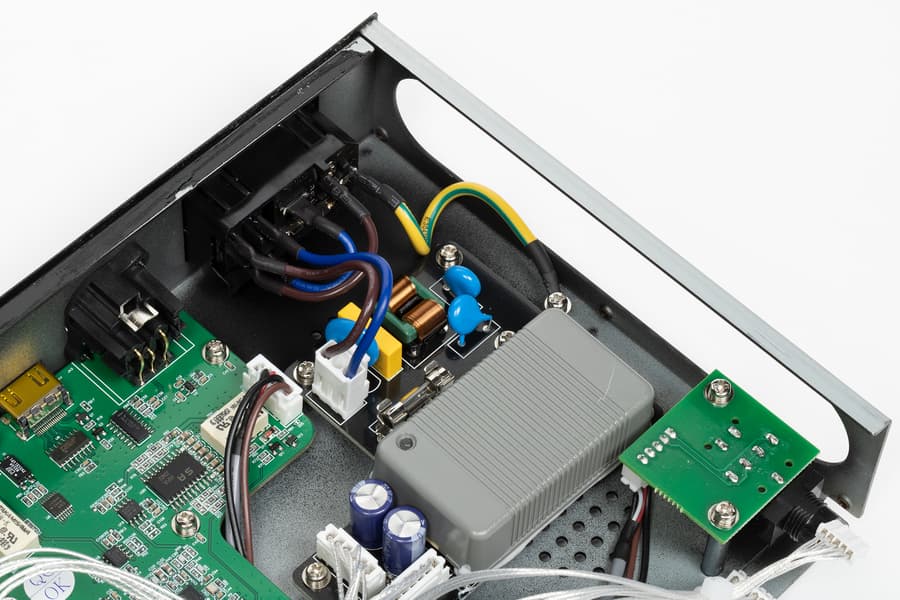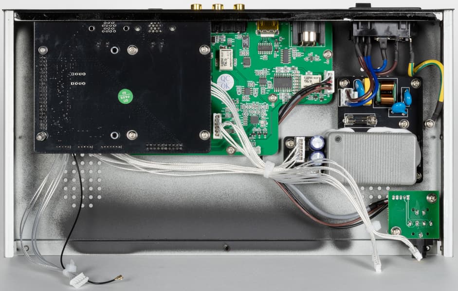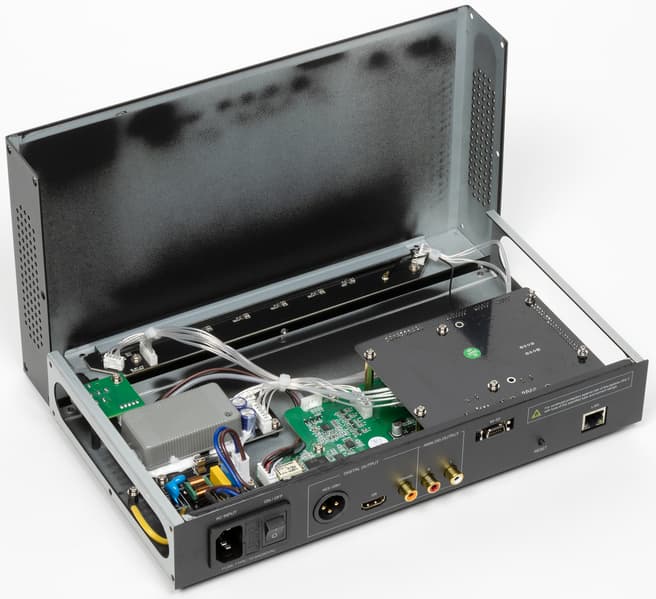 А вот что действительно расстроило, так это прочно приклеенная крышка, скрывающая наполнение платы блока питания. Демонтировать ее без риска повредить устройство невозможно — пришлось оставить на месте. Между тем, производитель в маркетинговых материалах делает немало акцентов на том, что питание организовано особым образом, обеспечивает сниженный уровень шумов... ну и так далее. Прошлая модель Silent Angel Bremen B1 даже поставлялась с базовым внешним блоком питания, а при желании можно было докупить БП Forester F1, сравнимый по стоимости с самим плеером. Теперь же производитель решил разместить все в одном корпусе, и было бы крайне любопытно посмотреть, как там все теперь устроено.