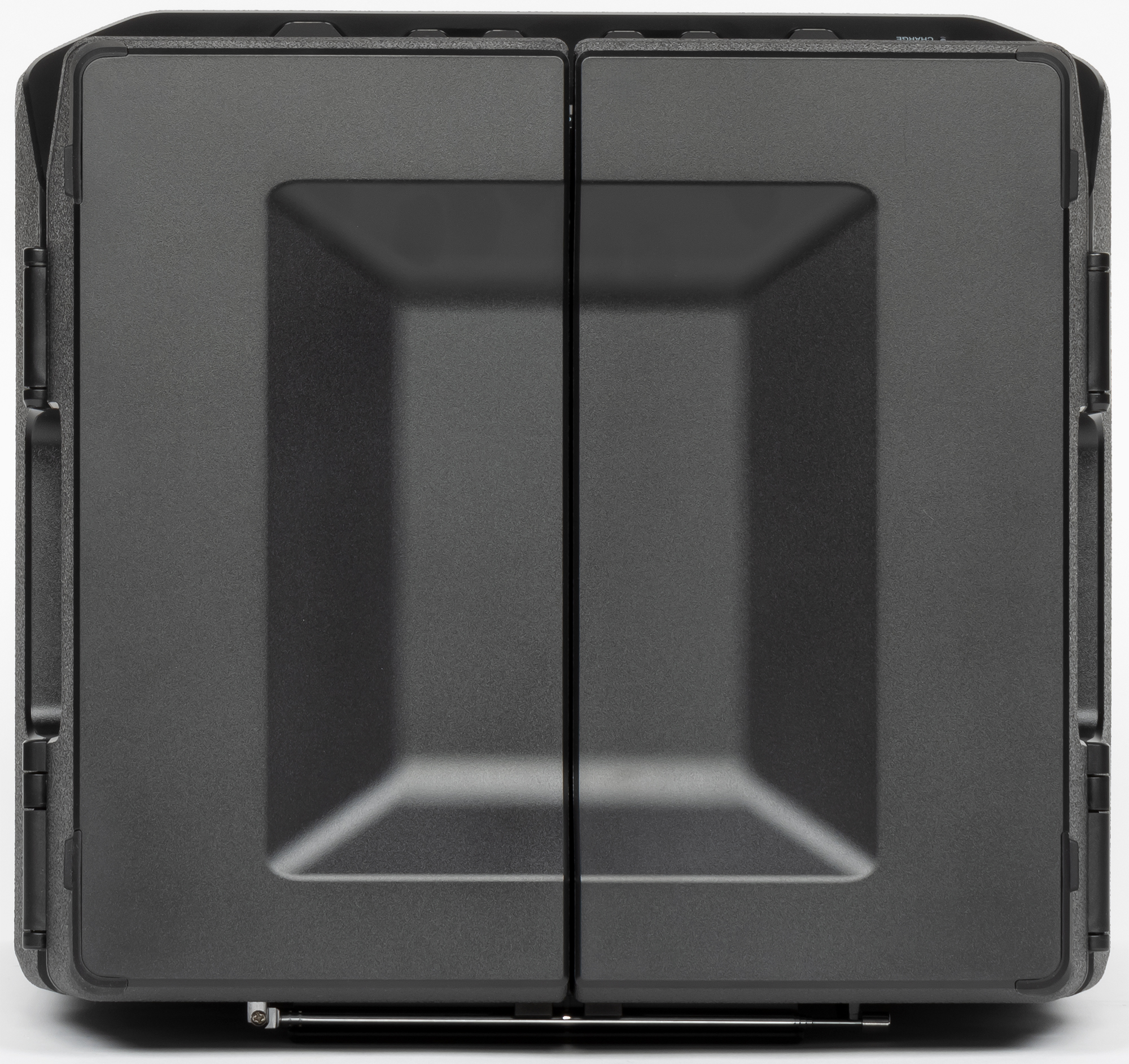 В сложенном состоянии выемки на откидных частях и верхней части корпуса формируют удобные ручки для переноски колонки.