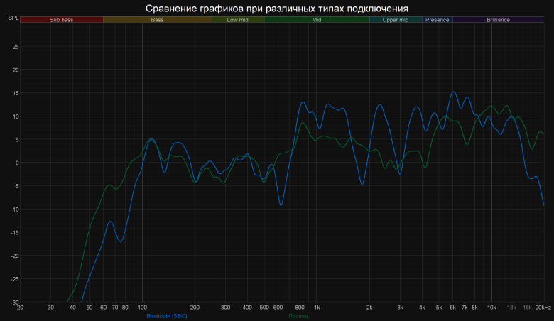 При подключении посредством Bluetooth в звучании появляются неприятные акценты на середине, при этом ее детальность основательно падает — изменения хорошо заметны на втором графике. Но здесь важно отметить, что получен он был при использовании кодека SBC — для измерений применялся ПК под управлением Windows, которая почему-то предпочла именно его. Добавить акцент на НЧ-диапазоне можно с помощью активации функции Mega Bass — «добавка» получается вполне очевидной, но при этом не чрезмерной.