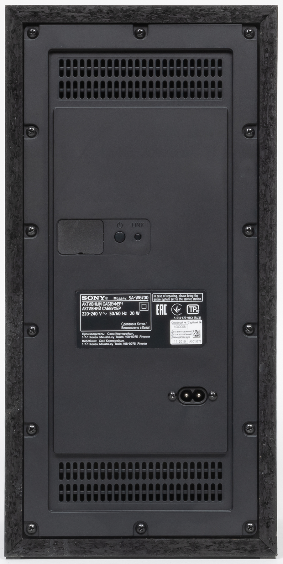 В верхней части передней панели расположено отверстие динамика, закрытое металлической сеткой. Под ним находится глянцевый раструб фазоинвертора. В верхнем левом углу расположен светодиодный индикатор подключения, заметный только в рабочем состоянии. На заднюю панель вынесены наклейка с информацией, да пара кнопок, плюс решетки вентиляции.
