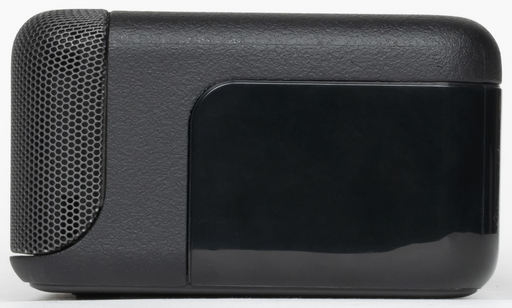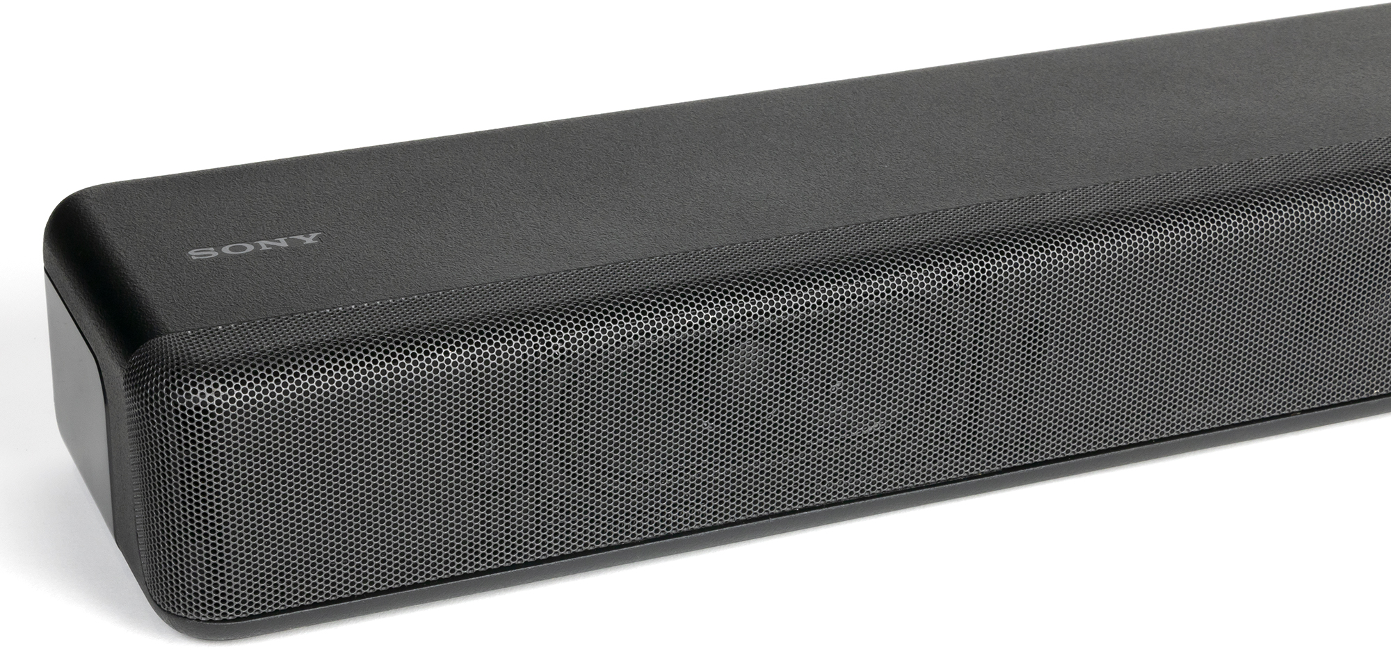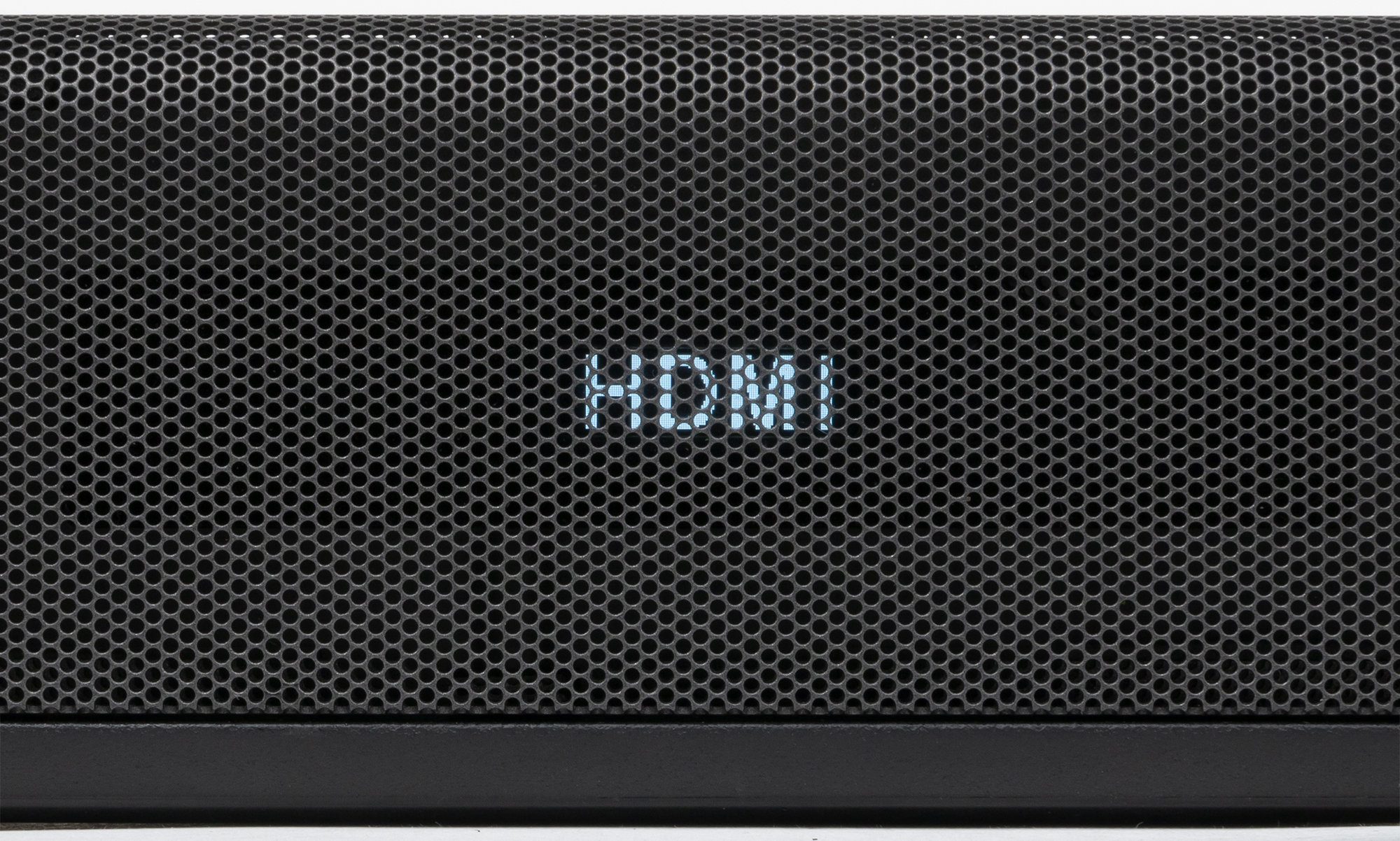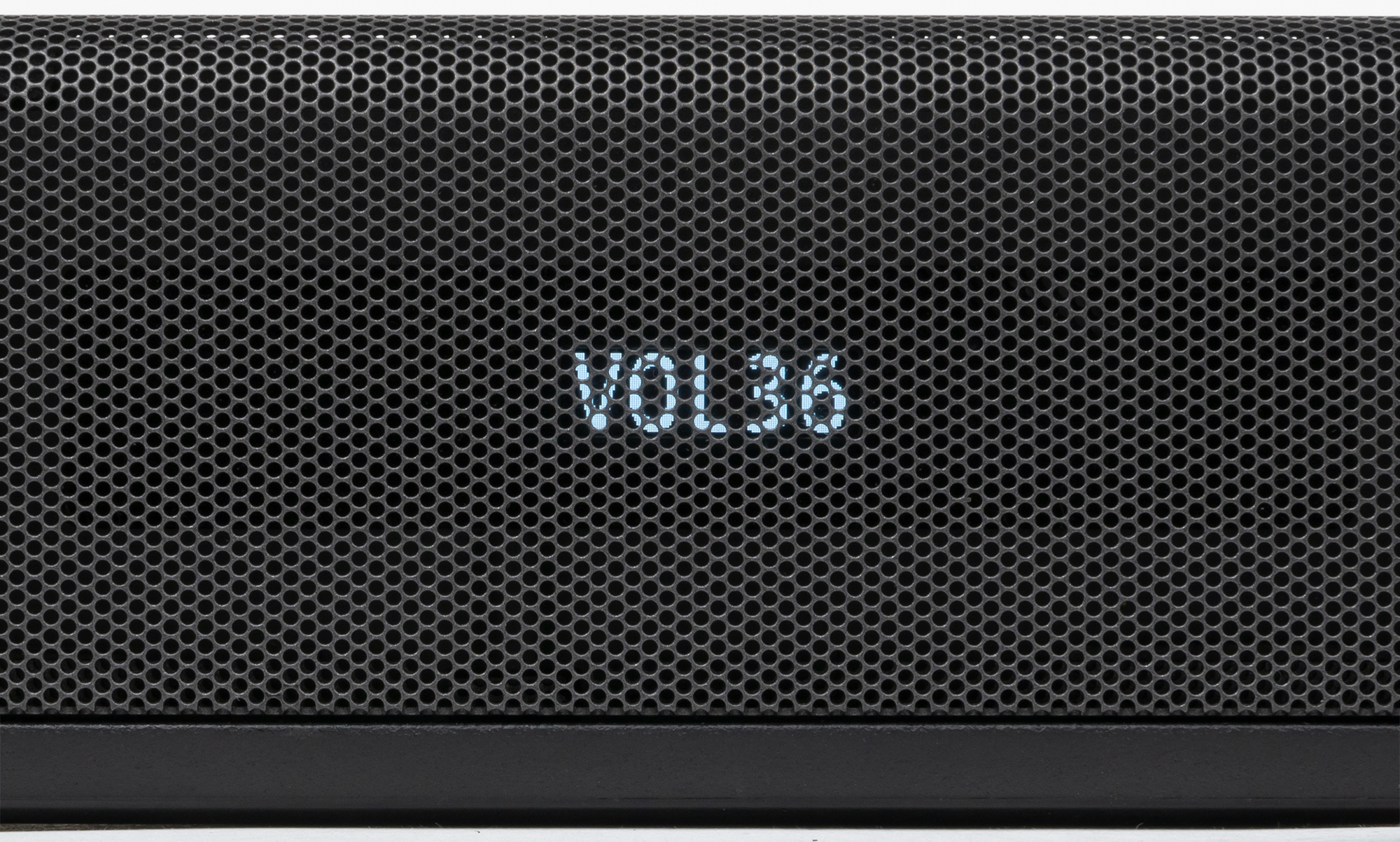 Передняя панель саундбара закрыта несъемной металлической сеткой, за которой виднеются три динамика и окно дисплея, размещенного там же.