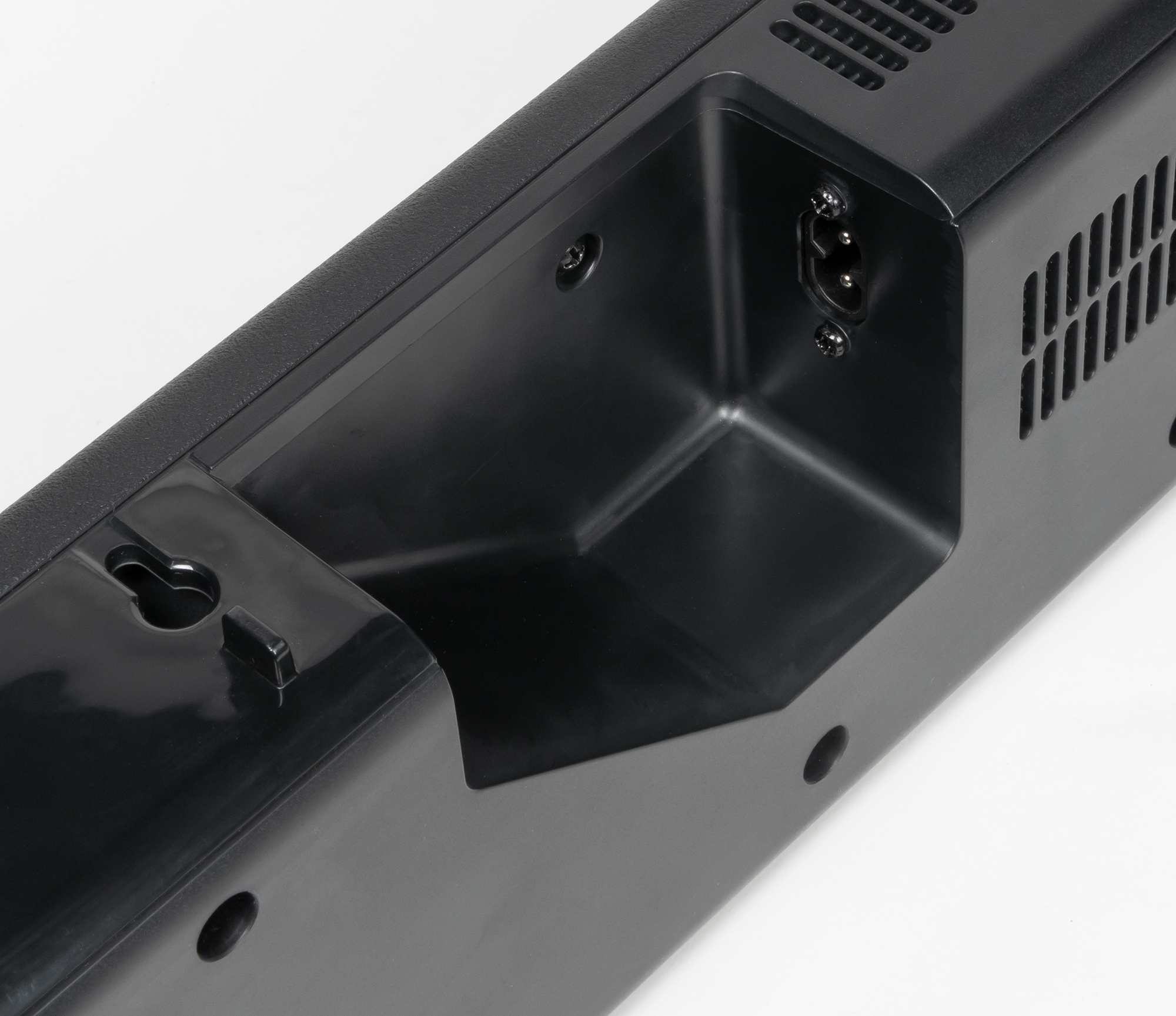 Задняя панель содержит отверстия для крепления устройства на стену, решетки и углубления, в которых размещены панели с разъемами для подключения, о наполнении которых мы поговорим отдельно.