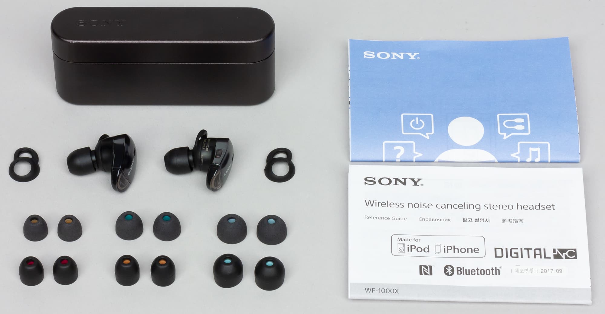Внутри — пара наушников, бокс для зарядки, 6 пар сменных амбушюр (3 пары из резины, 3 пары из пеноматериала), запасная пара ушных петель, стартовый буклет и небольшой справочник.