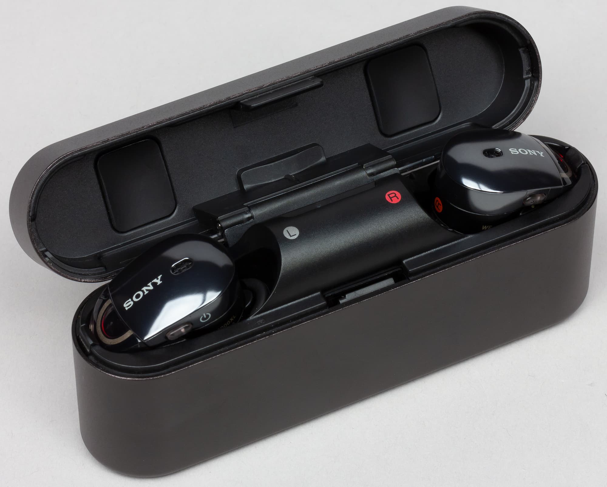 Для открытия крышки требуется хорошо дозированное усилие: бокс достаточно легко открыть, однако случайные раскрытия в кармане исключены. Внутри располагаются два формованных отверстия с контактными площадками и маркировкой, указывающей, для какого наушника предназначено конкретное отверстие. На крышке расположены вставки для более плотного удержания наушников внутри бокса.