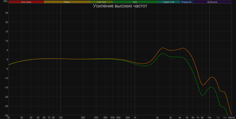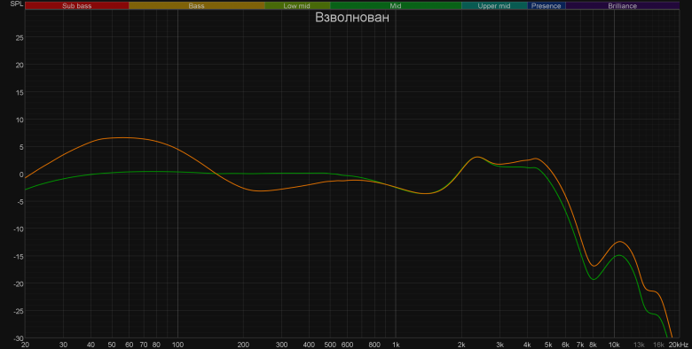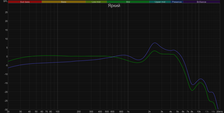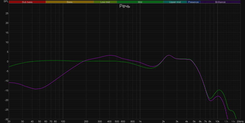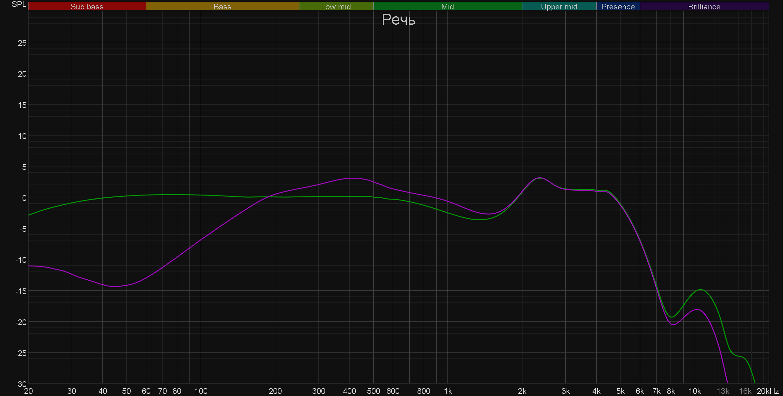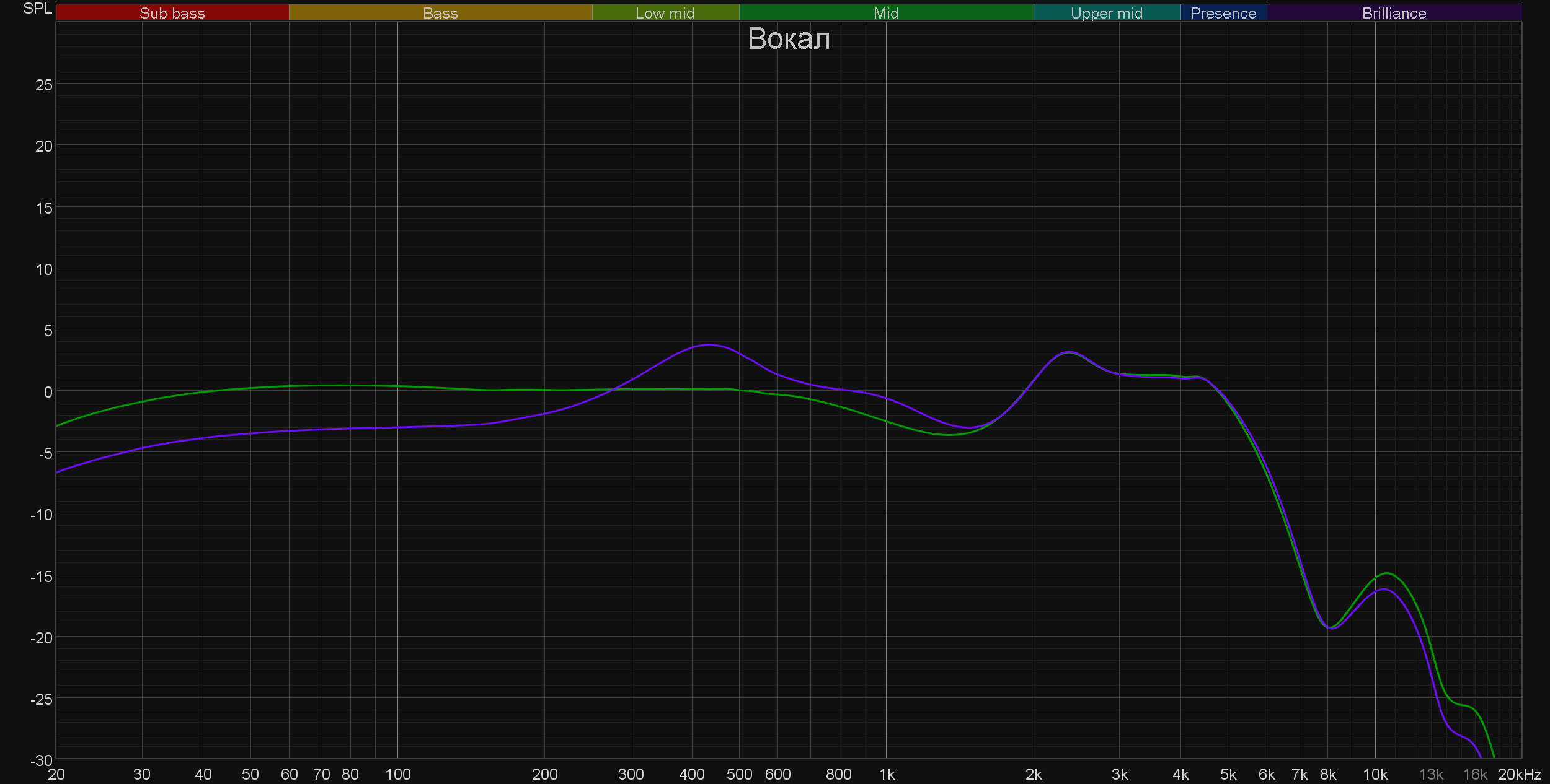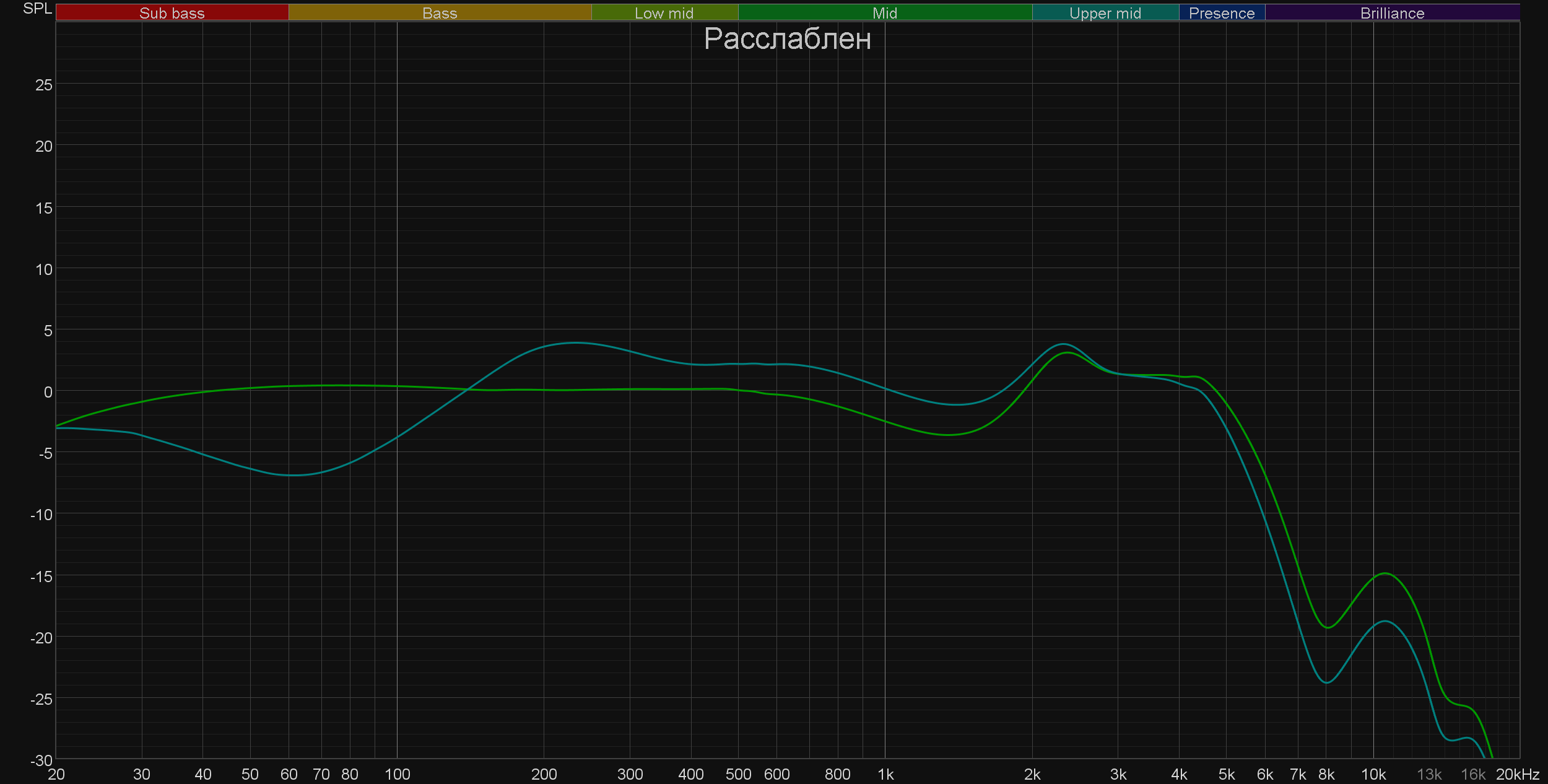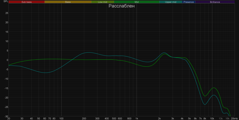 Низкочастотный диапазон ровный, «глубокий бас» немного уведен назад и это хорошо — меньше гулкости. Провал в районе 1,5 кГц дает нам то самое ощущение немного ушедшего назад вокала, ну и с ВЧ-диапазоном тоже все понятно. В целом все очень наглядно, но можно сделать еще нагляднее.