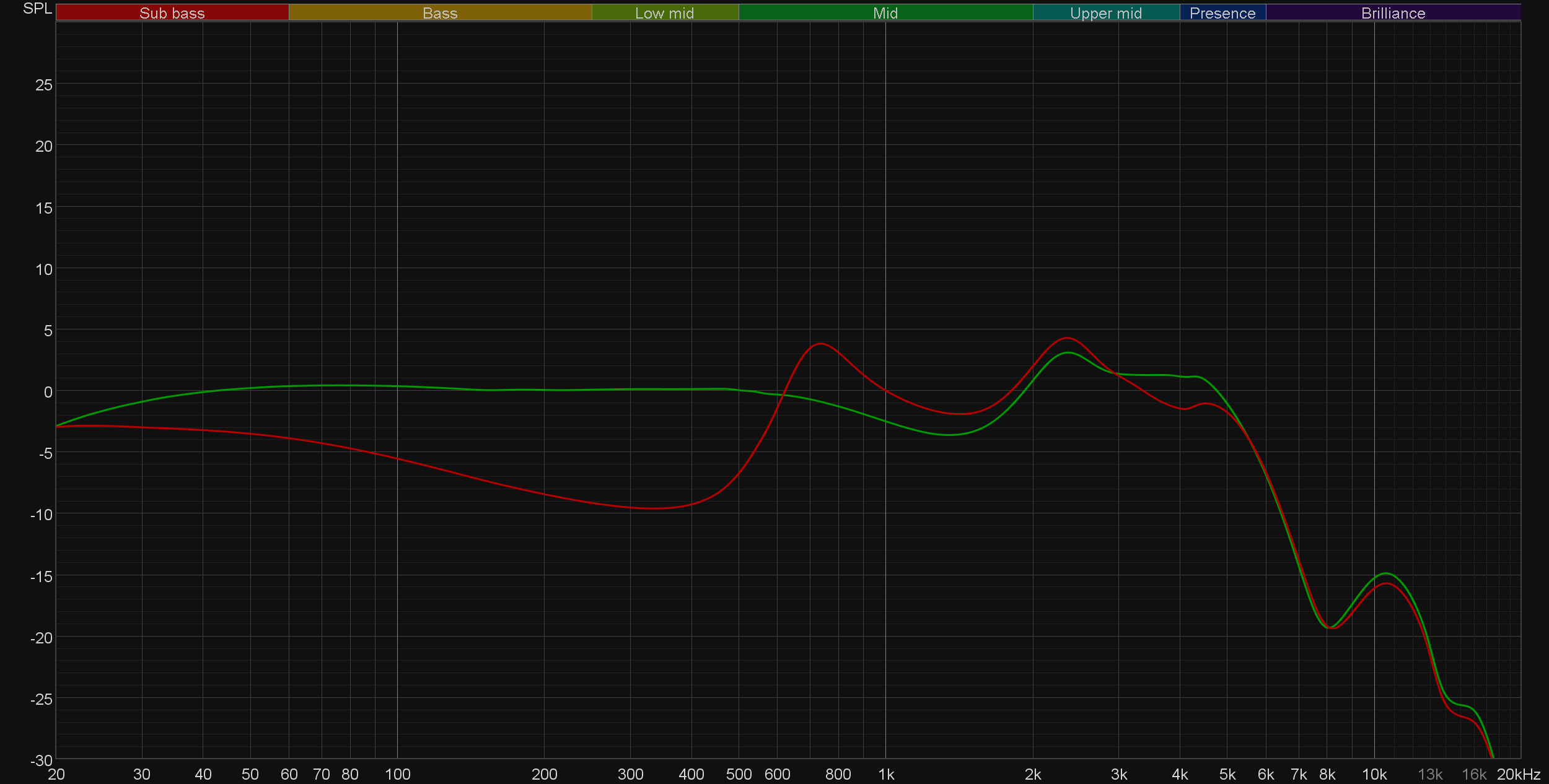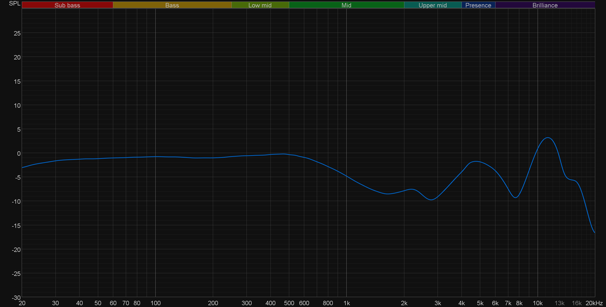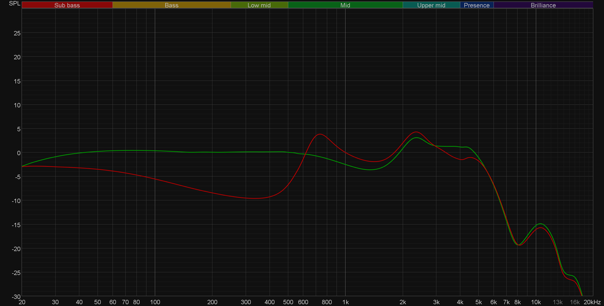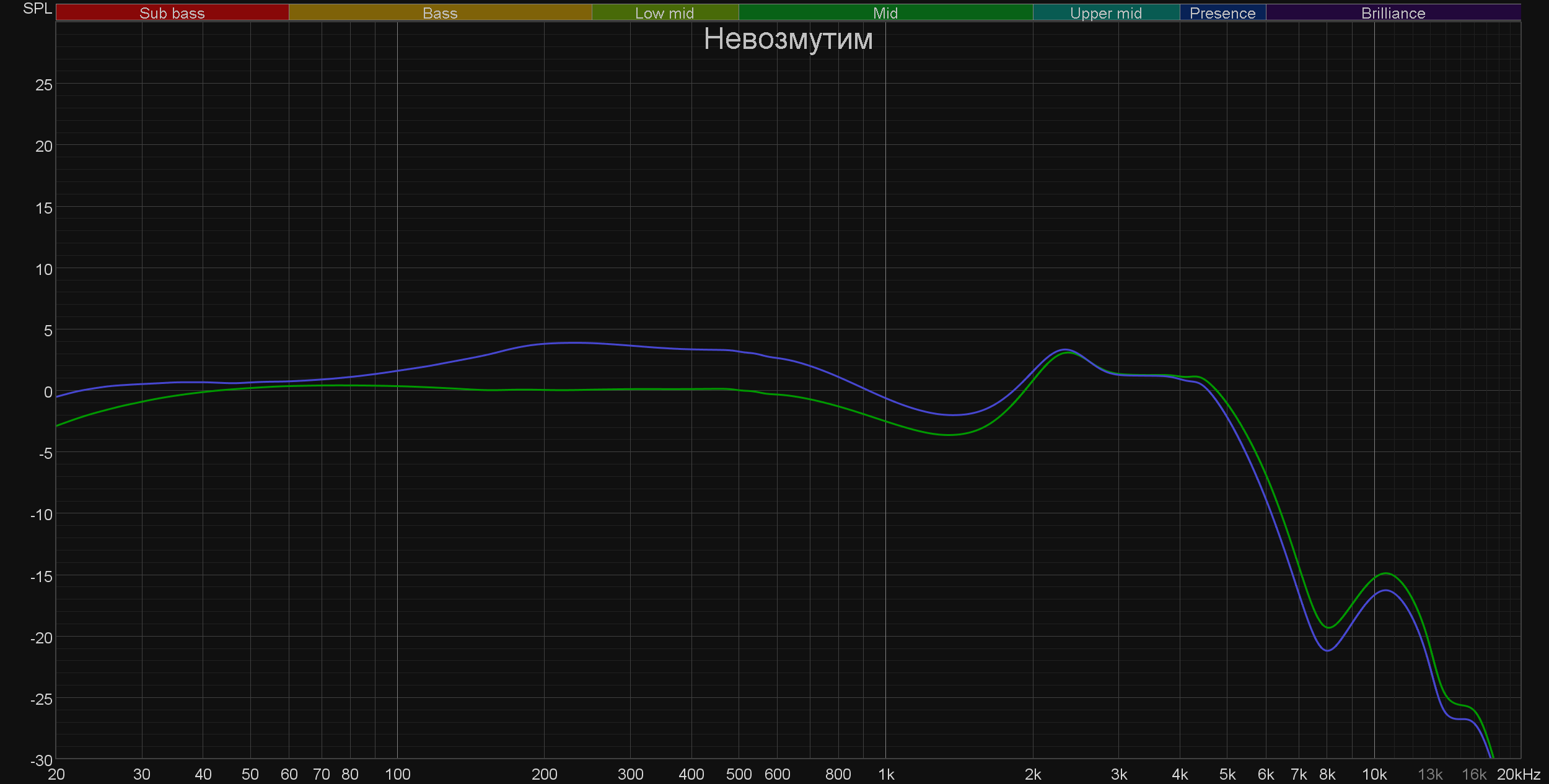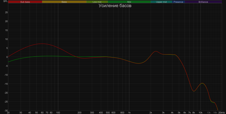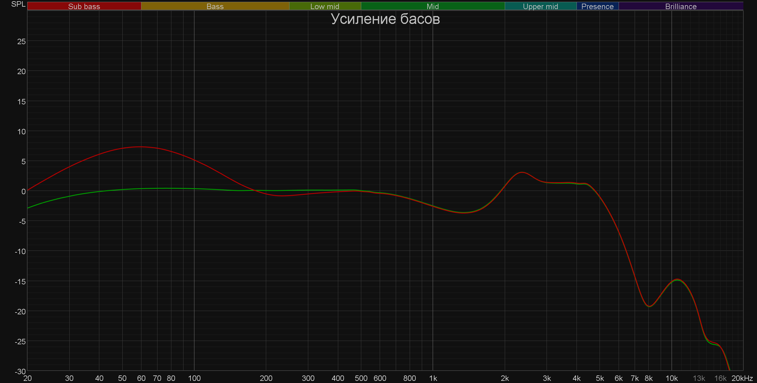Низкочастотный диапазон ровный, «глубокий бас» немного уведен назад и это хорошо — меньше гулкости. Провал в районе 1,5 кГц дает нам то самое ощущение немного ушедшего назад вокала, ну и с ВЧ-диапазоном тоже все понятно. В целом все очень наглядно, но можно сделать еще нагляднее.