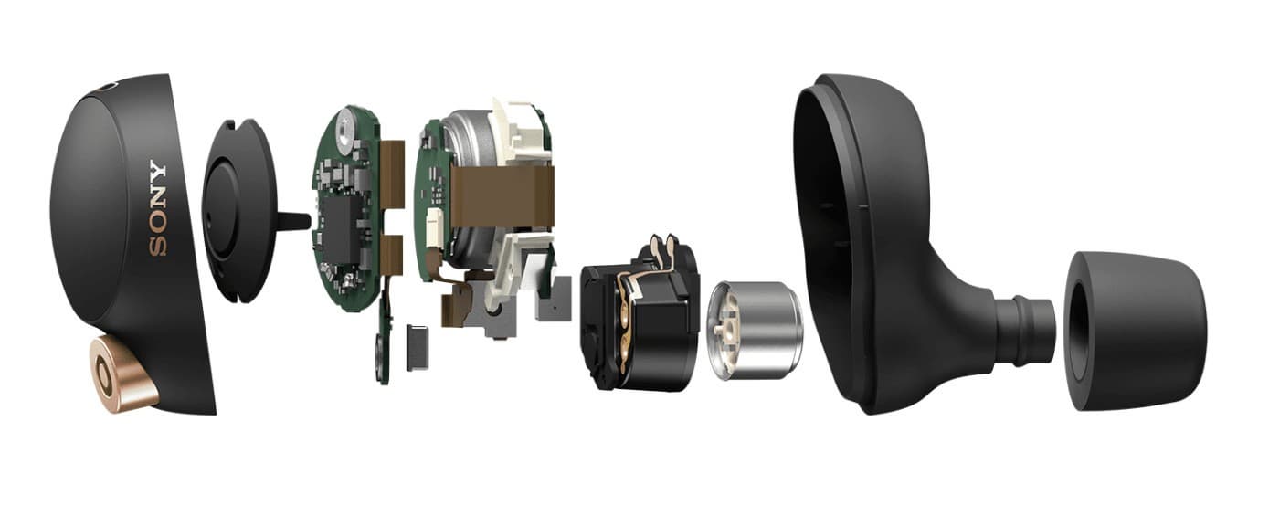 Раз уж заговорили о микрофонах, скажем пару слов про внутренности наушников. Sony анонсирует новый процессор V1, который сочетает в себе технологию шумоподавления хорошо зарекомендовавшего себя в прошлой модели процессора QN1e, плюс ряд новых «фишек». За звук отвечает 6-миллиметровый динамик с увеличенным на 20% объемом магнита и высокоэластичным диффузором. Работу голосовой связи и шумоподавления обеспечивают по два микрофона в каждом наушнике, плюс датчики костной проводимости. В материалах от производителя есть демонстрирующая конструкцию наушников иллюстрация, которую мы с удовольствием и позаимствуем.