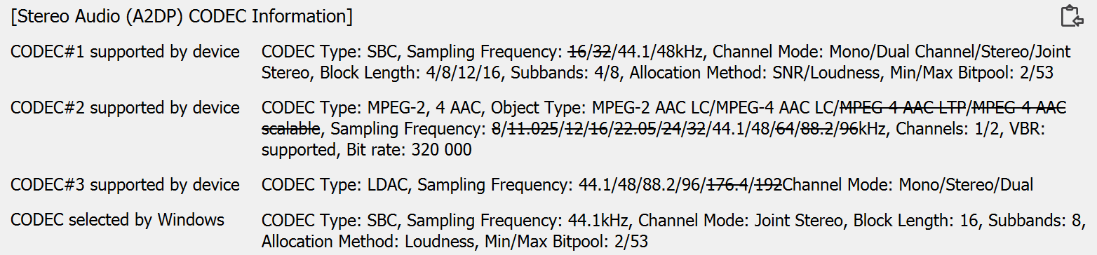 К великому нашему удивлению и даже разочарованию, мультипойнт WF-1000XM4 не поддерживает. Для ряда потенциальных пользователей это не очень важно, но множество людей привыкло использовать наушники параллельно со смартфоном и ноутбуком, например — это удобно, отказаться от такой возможности может быть сложно даже ради действительно хорошей по другим параметром гарнитуры. После подключения устройства к ПК под управлением Windows 10 мы традиционно получили список поддерживаемых кодеков и их режимов с помощью утилиты Bluetooth Tweaker.