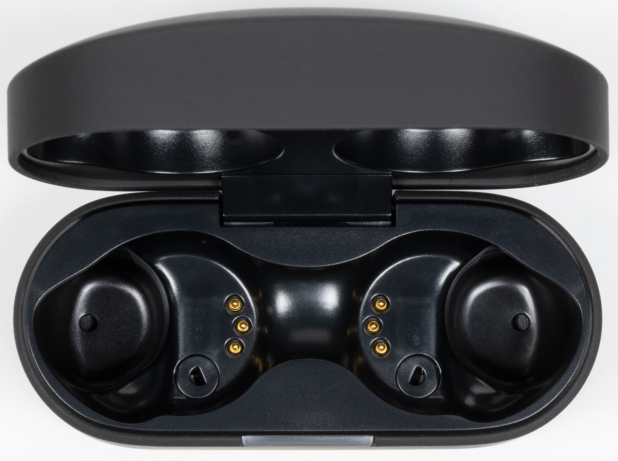 Магнитное крепление крепко удерживает наушники, при этом достать их максимально просто — обхватываем корпус пальцами, тянем немного на себя и вверх. Внутри слотов видны подпружиненные контакты для зарядки. Размещены они довольно высоко и удобно, при необходимости их легко будет очистить от загрязнений.