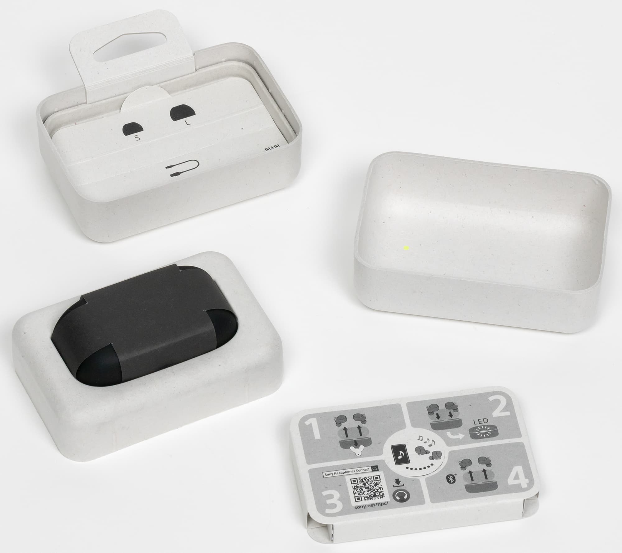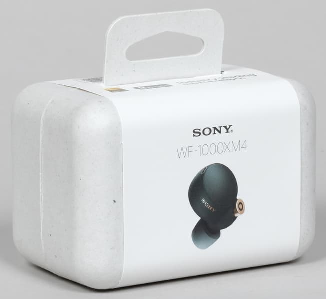 Поставляется WF-1000XM4 в коробке из вторсырья. Кому-то может показаться недостаточно «дорого-богато» для такого ценового сегмента, но в целом выглядит весьма оригинально и привлекательно. На обечайку из белого картона нанесены изображение и название гарнитуры, а также краткие характеристики.