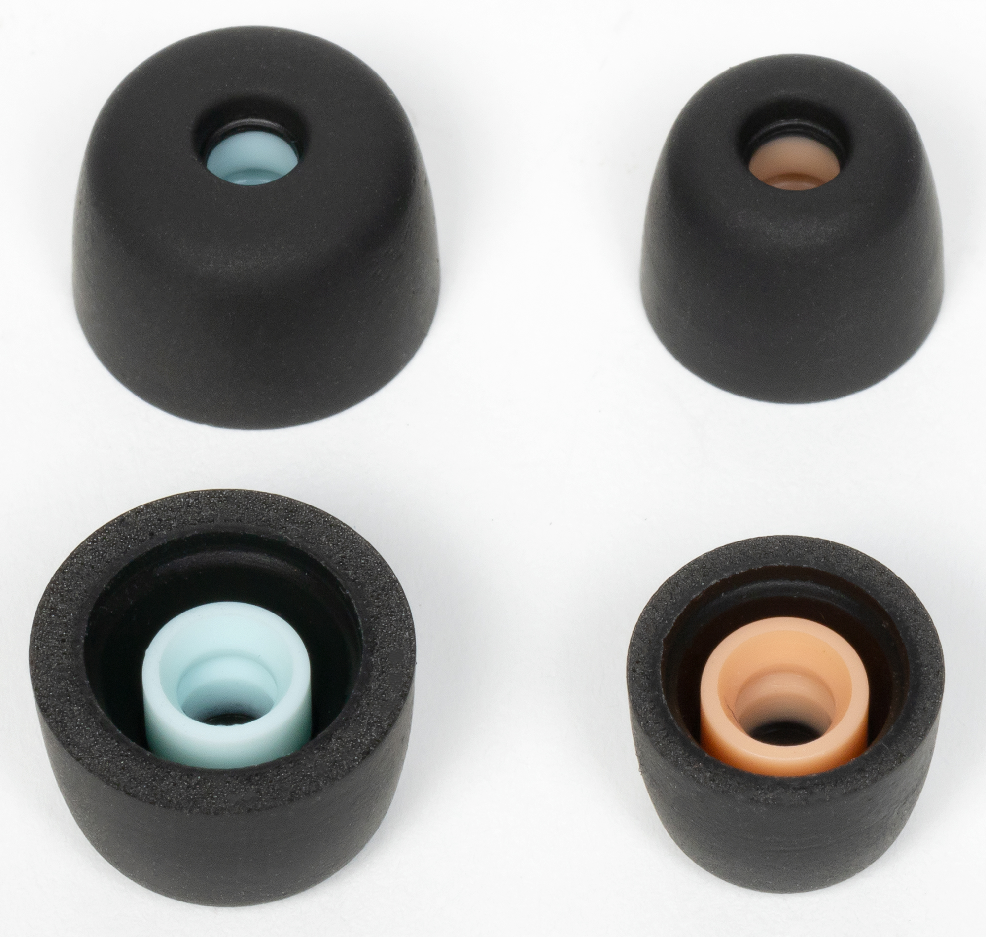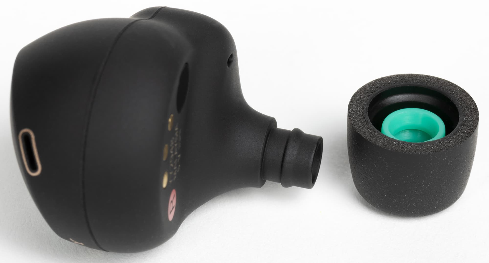 В комплекте с Sony WF-1000XM3 шли как силиконовые, так и пенные насадки. В этот раз производитель решил укомплектовать устройство лишь вторыми. Вот только целому ряду пользователей пенные амбушюры категорически не подходят — неудобно, не держатся и так далее. Было бы здорово все же иметь выбор. К счастью, крепление у насадок стандартное, всегда можно подобрать подходящие.