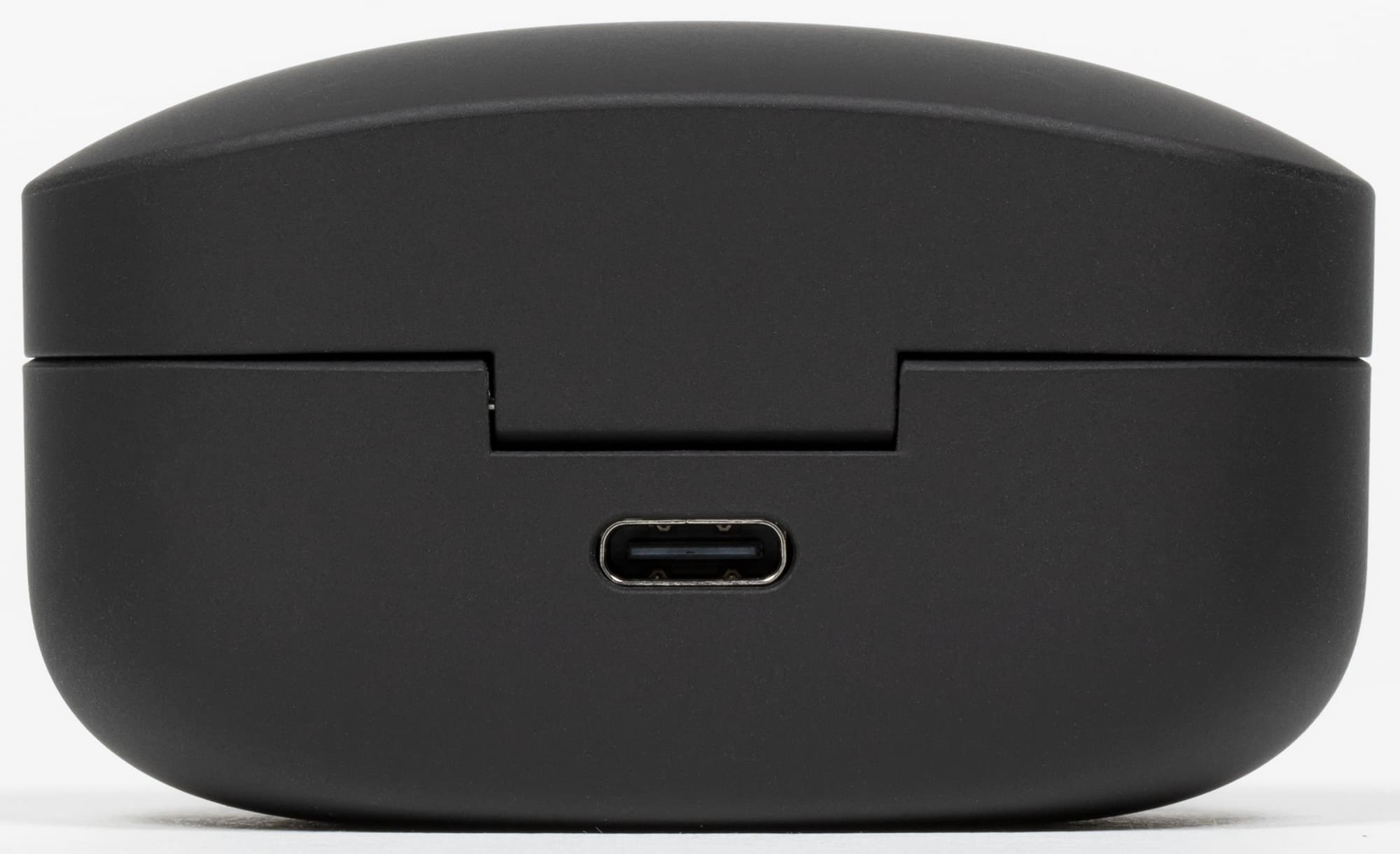 На задней стенке расположен порт USB Type C для зарядки, выше видна петля, обеспечивающая открытие крышки. У нее есть довольно ощутимый люфт, который вряд ли может повлиять на надежность конструкции и удобство ее использования. В целом и футляр, и сами наушники собраны хорошо — вполне на уровне, который ожидаешь от дорогого брендового устройства.