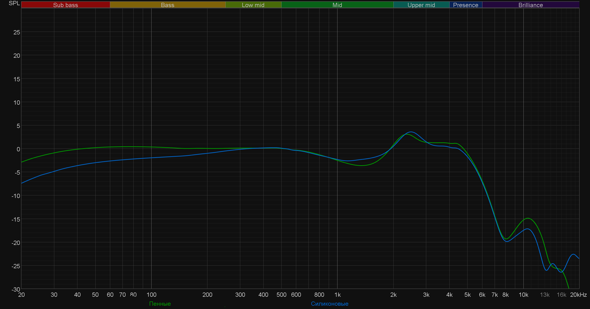 Низкие частоты еще немного уходят назад, освобождая чуть больше места для середины. Они по-прежнему хорошо воспринимаются, но звучат просто крайне деликатно. Любителям легкого комфортного звучания может понравиться — поэкспериментировать стоит, особенно учитывая влияние насадок на комфорт и надежность посадки наушников.