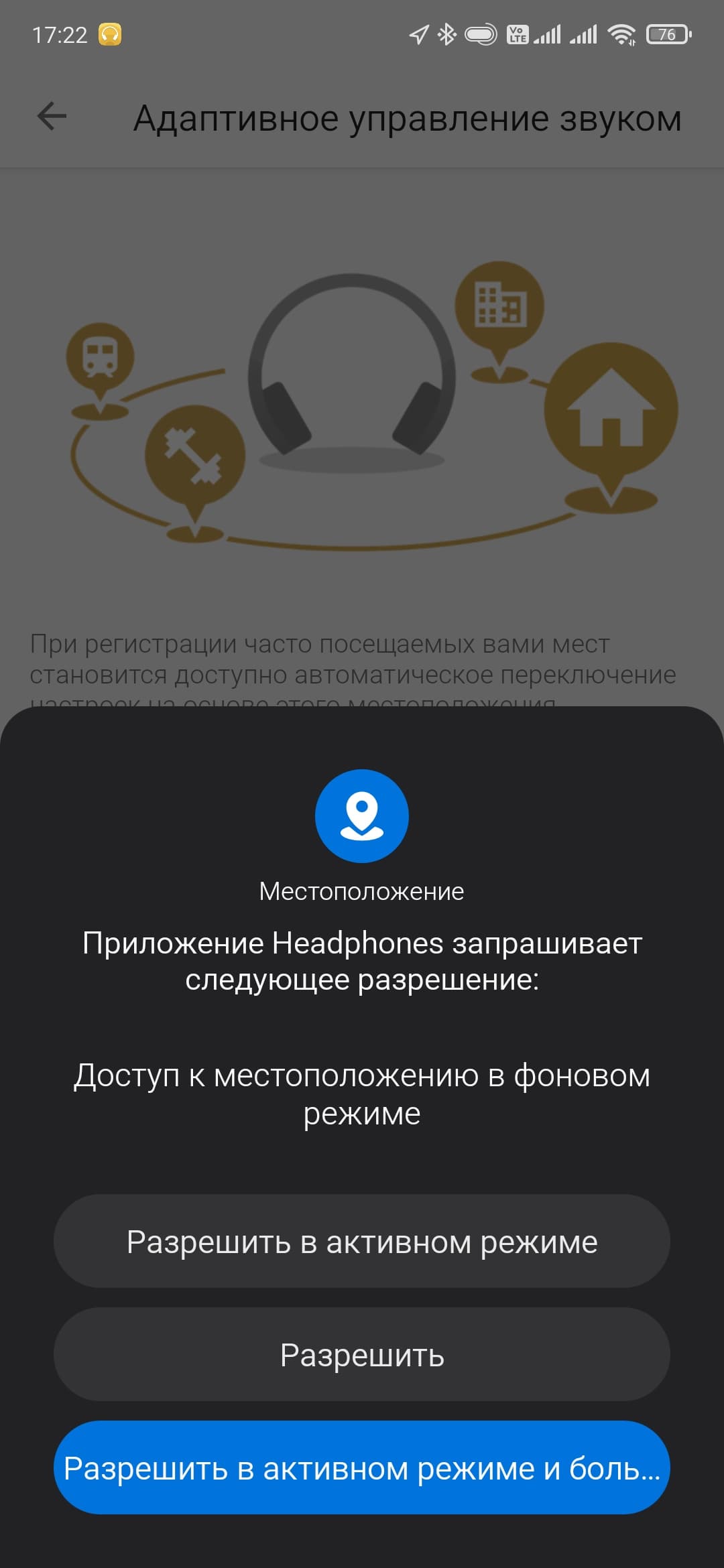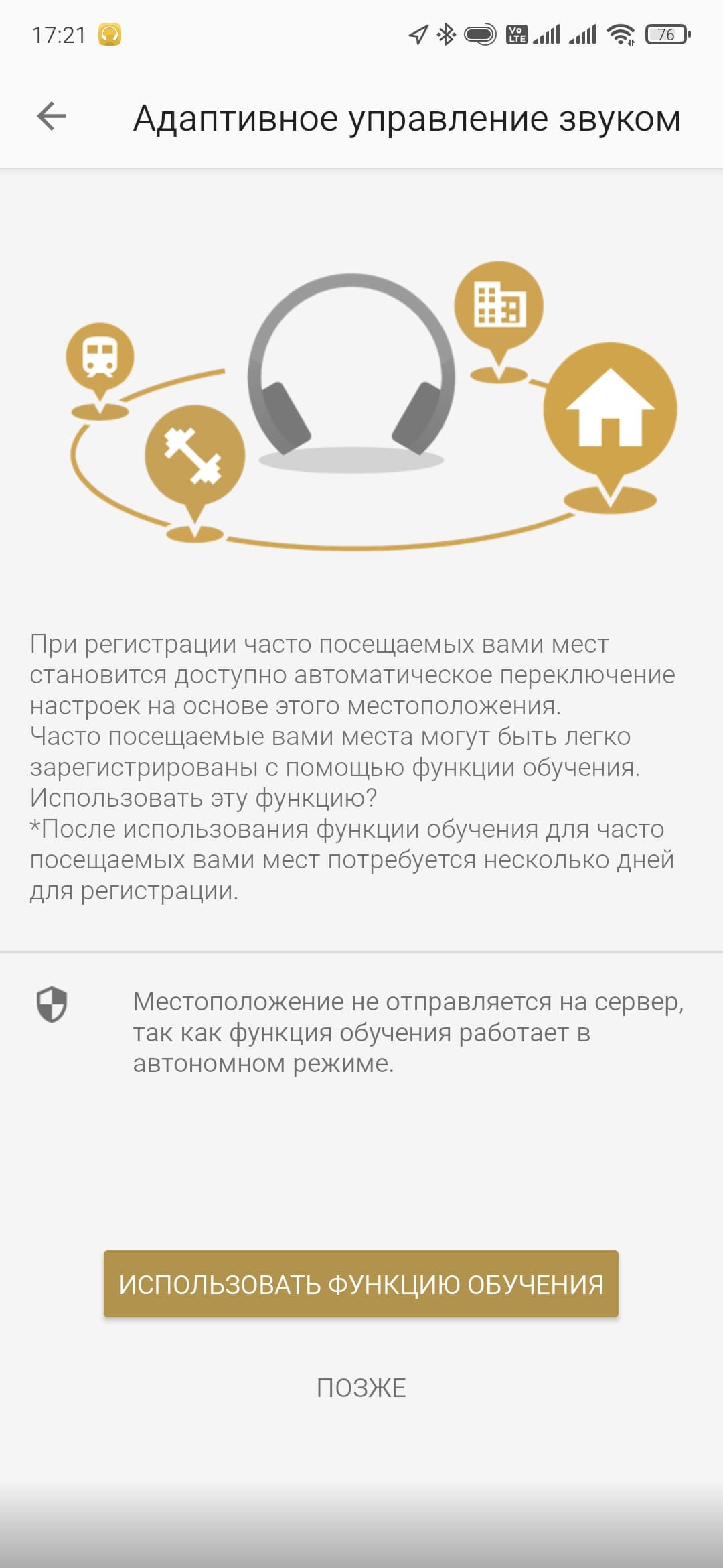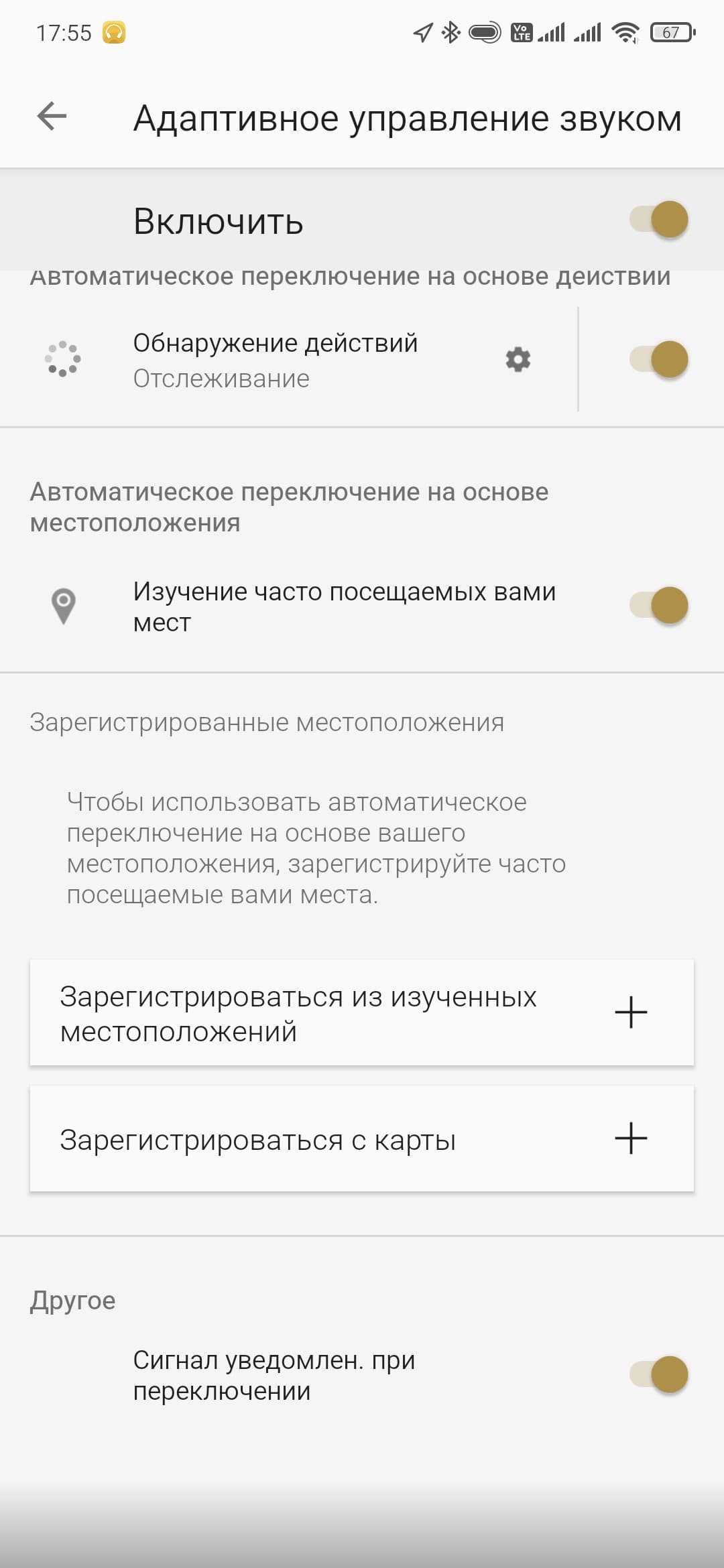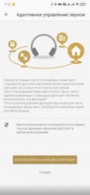 Для полноценной работы функции нужен доступ к геопозиции, который приложение настойчиво запрашивает. Некоторое время система собирает данные о часто посещаемых местах, запоминает используемые в них настройки и активирует их, как только пользователь вновь там оказывается. Довольно любопытная возможность, которая периодически действительно пригождается. Например, очень радует отключение «шумодава» при возвращении домой.