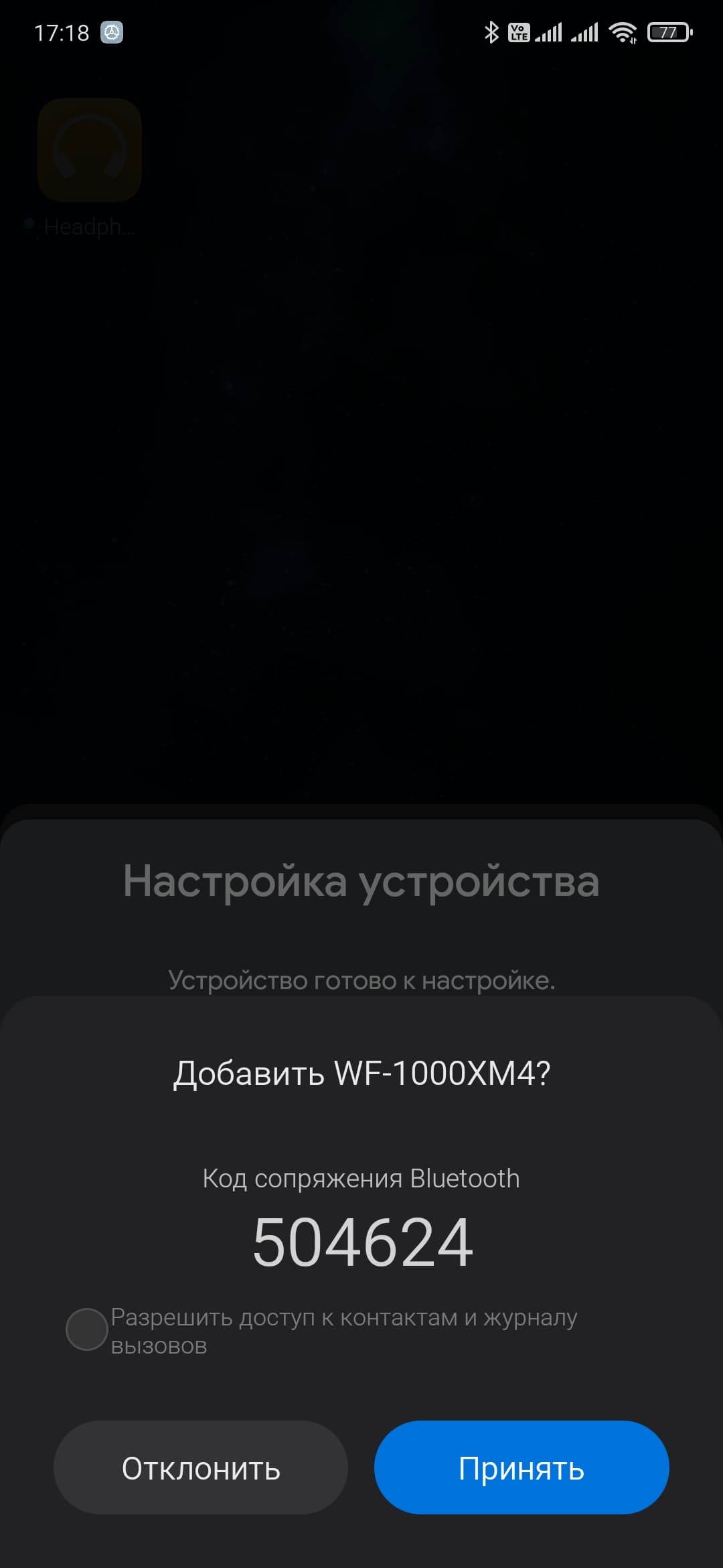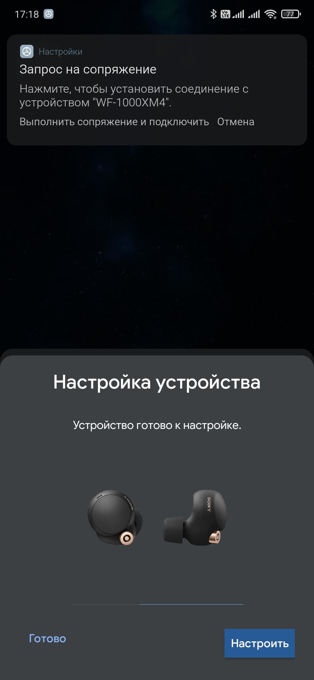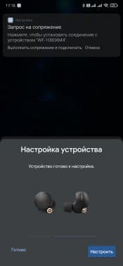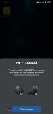 Sony WF-1000XM4 поддерживает Google Fast Pair для сопряжения с Android-устройствами, а также Microsoft Swift Pair для соединения с гаджетами, работающими на Windows 10. Все происходит быстро и легко: достаем наушники, если мы сделали это в первый раз — они сразу активируют режим сопряжения. Принудительно процесс можно запустить одновременным длительным касанием обеих сенсорных зон. Практически сразу появляется уведомление о возможности подключения гарнитуры и привязки ее к аккаунту — соглашаемся, потом еще пару раз соглашаемся. Меньше минуты — и готово.