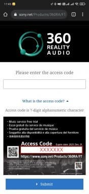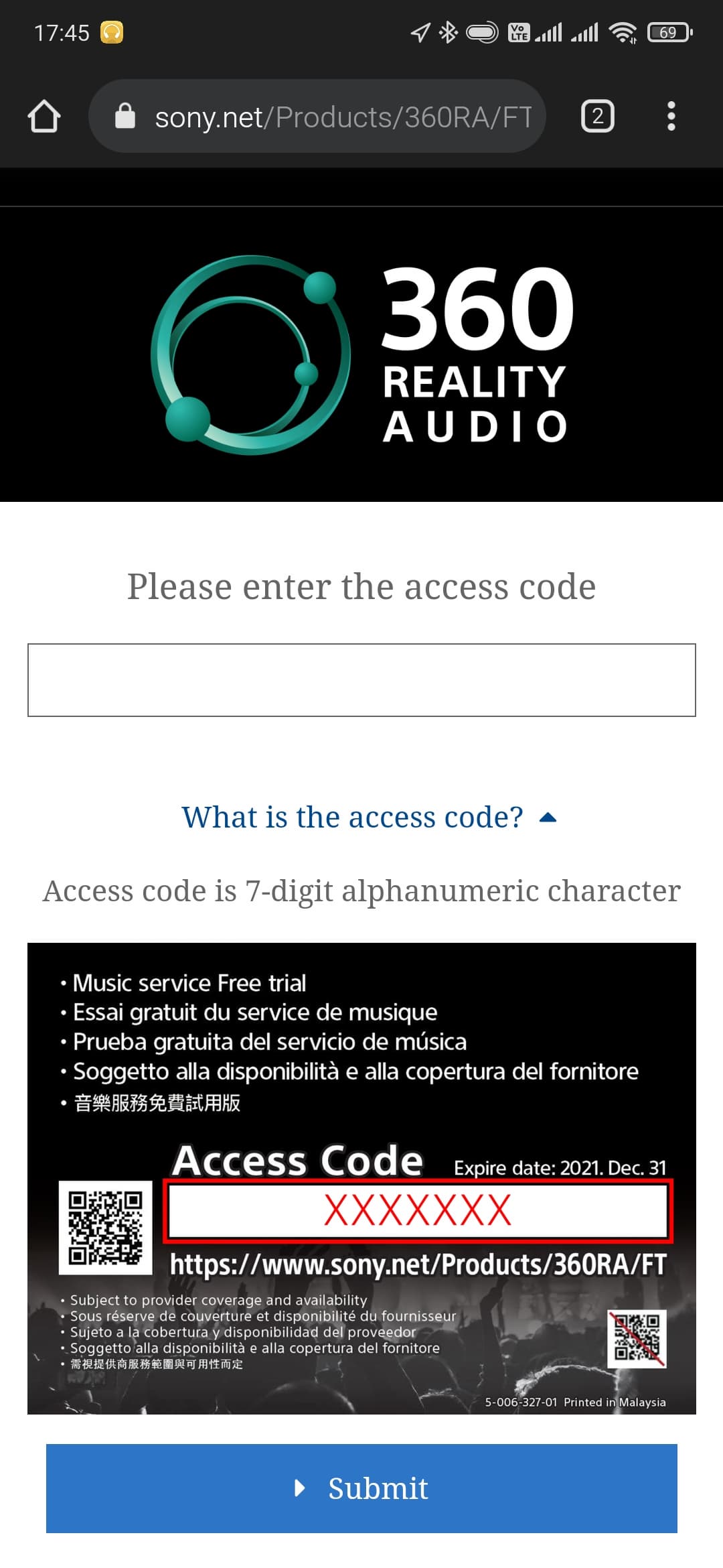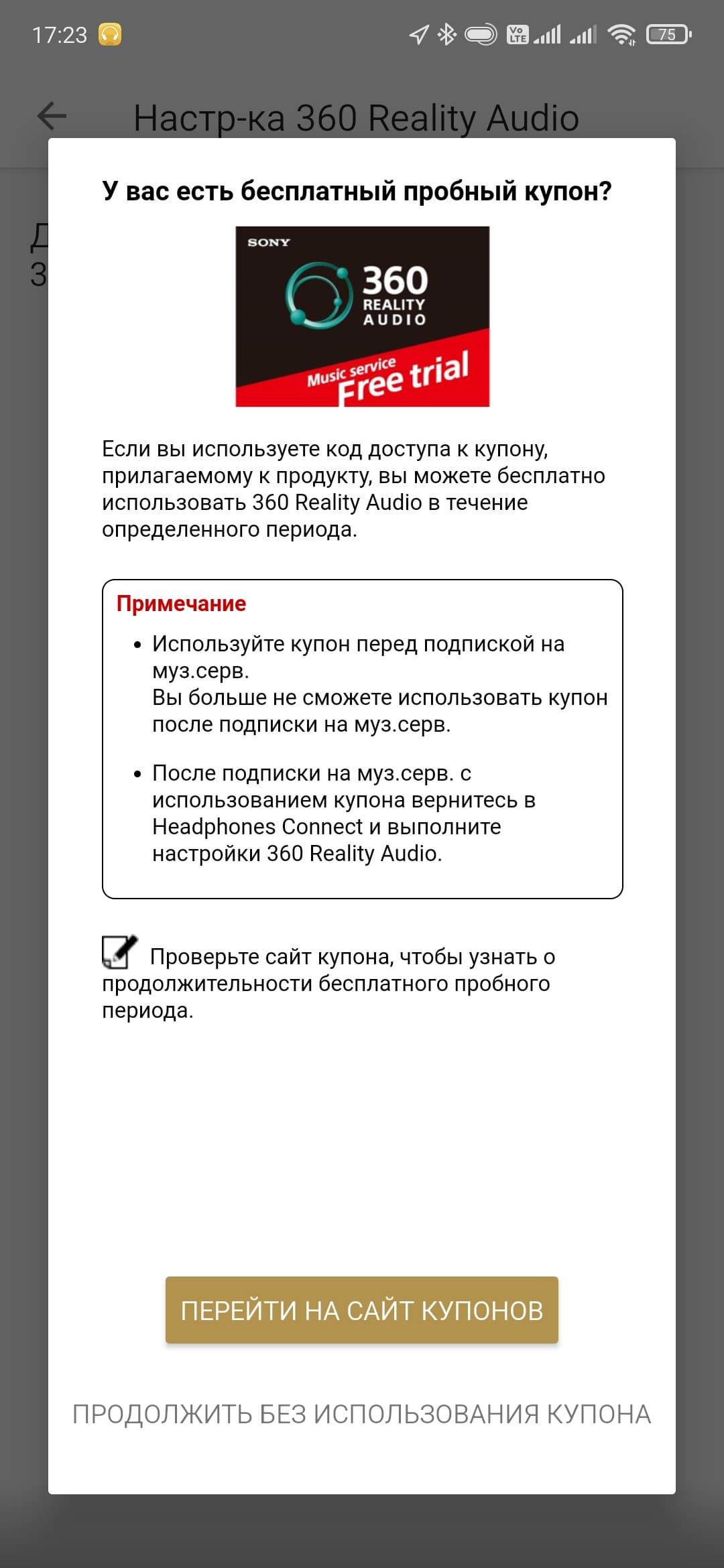 И первым делом приложение предлагает нам воспользоваться бесплатной подпиской на стриминговые сервисы, который этот самый 360 Reality Audio поддерживают. Клик по ссылке ведет на сайт Sony, где нам предлагается ввести код с купона, который мы обнаружили в коробке с устройством.