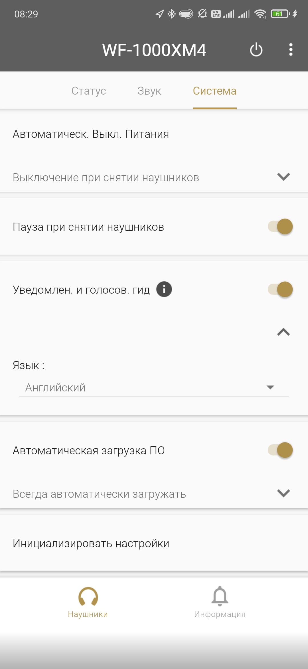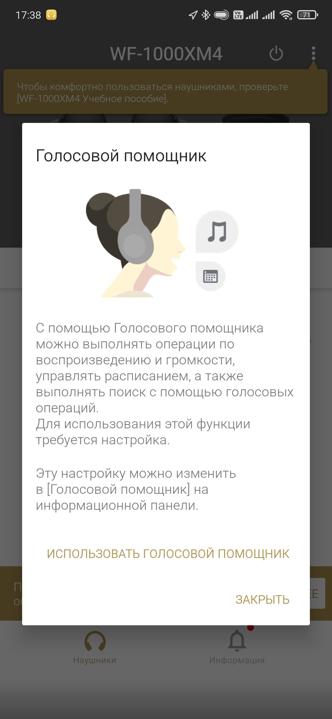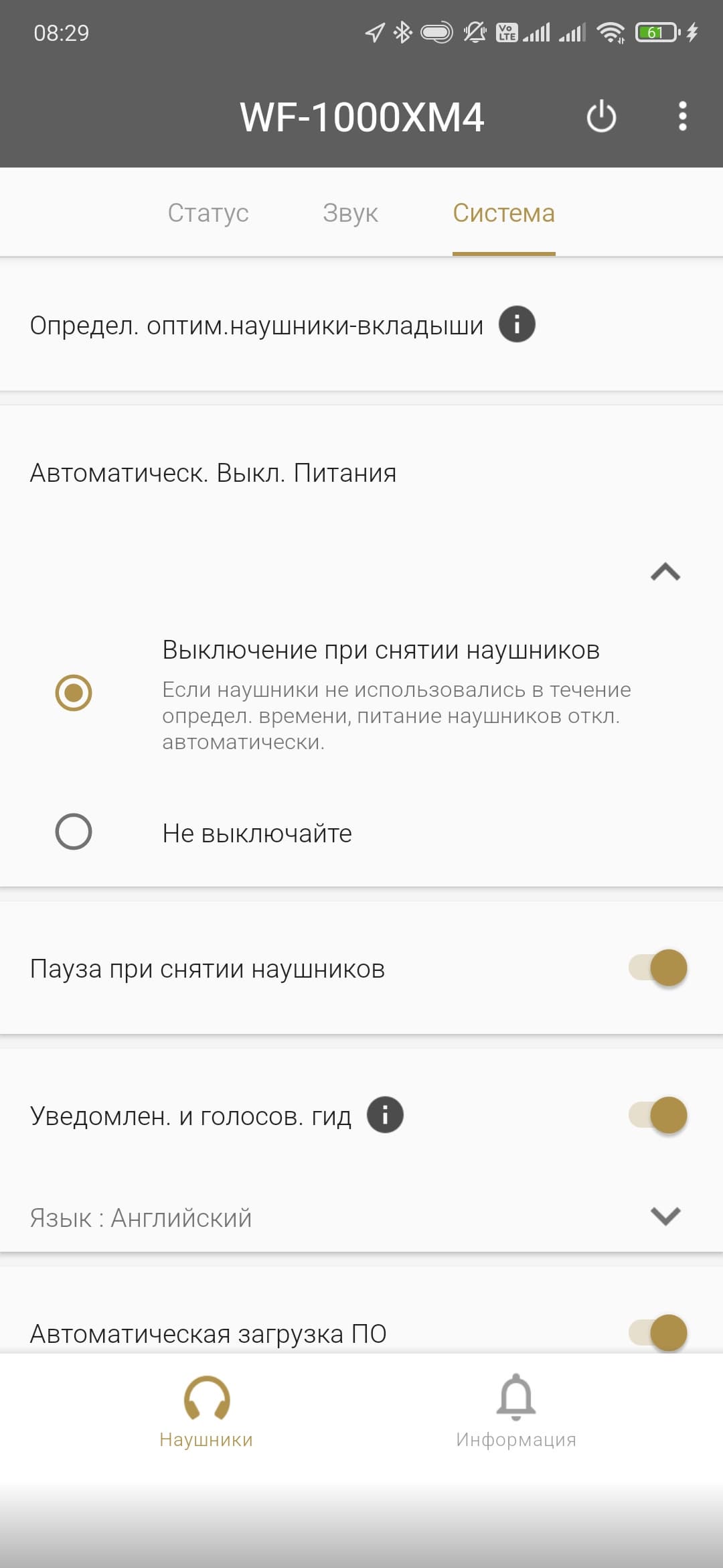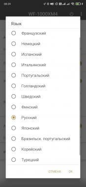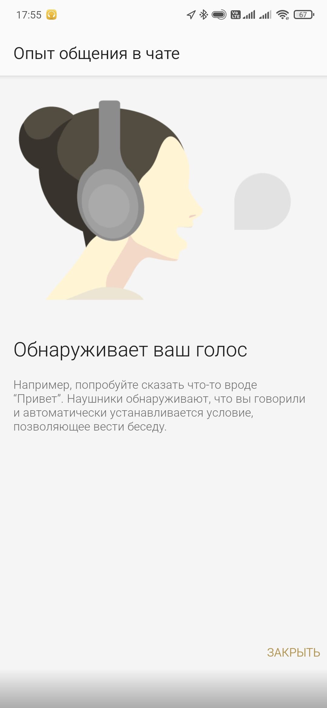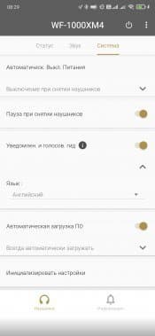 Обо всех своих действиях WF-1000XM4 оповещает голосовыми уведомлениями. По умолчанию они воспроизводятся на английском, но язык можно изменить в настройках (в том числе, и на русский). Ну и, наконец, если хочется начать все сначала — можно заново запустить гид по настройке, на который мы уже посмотрели выше.