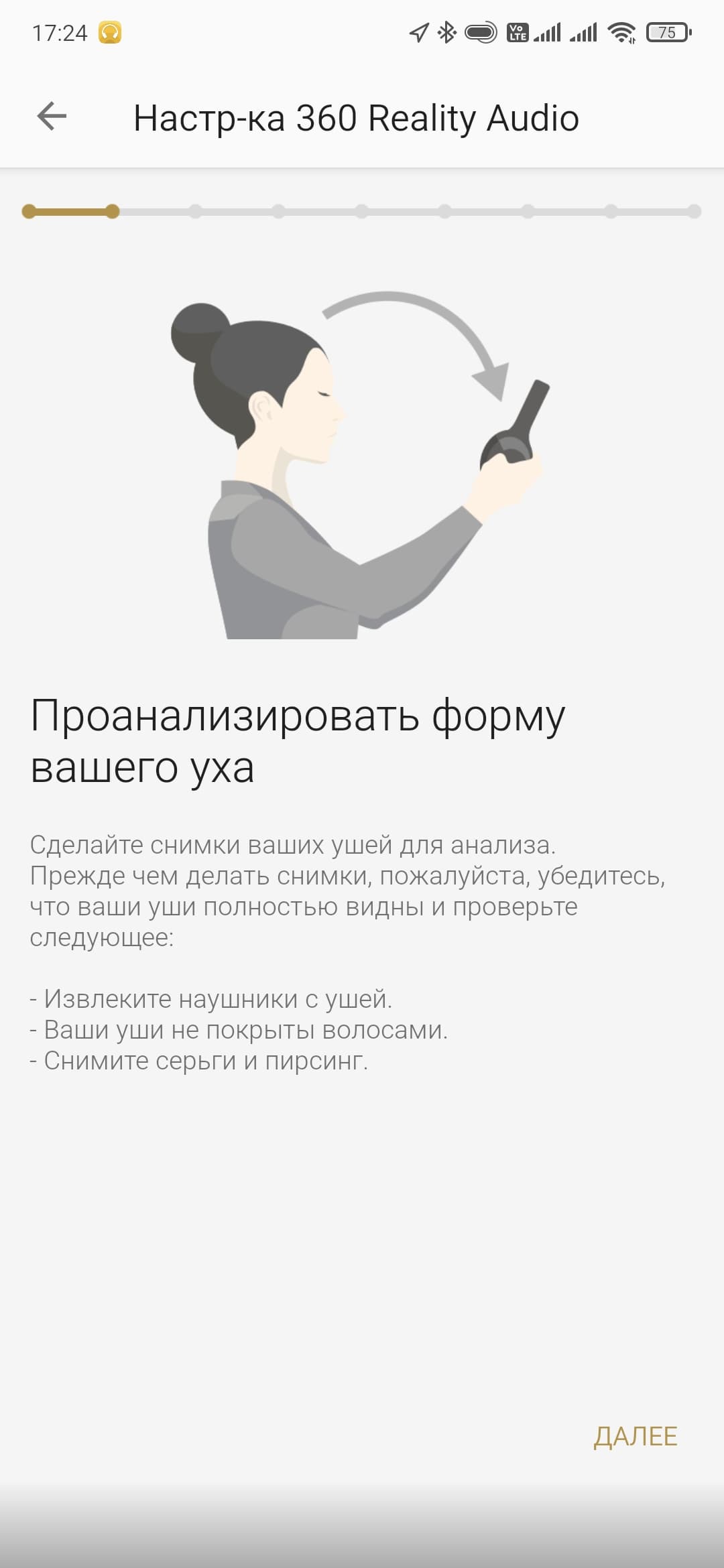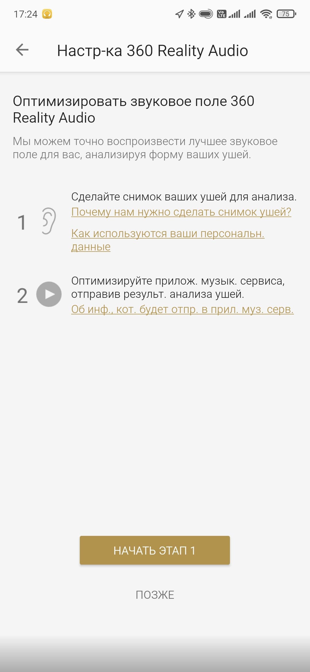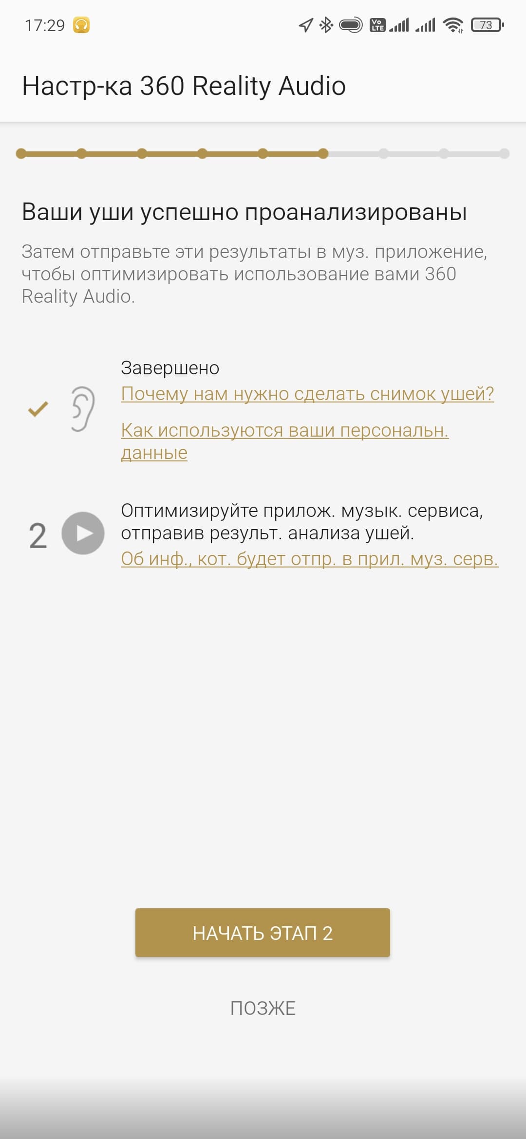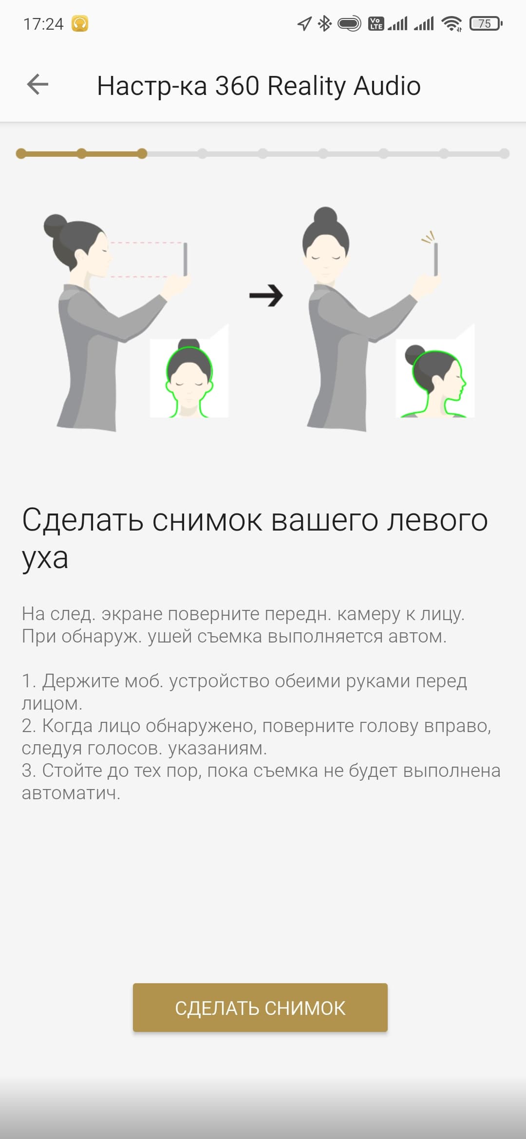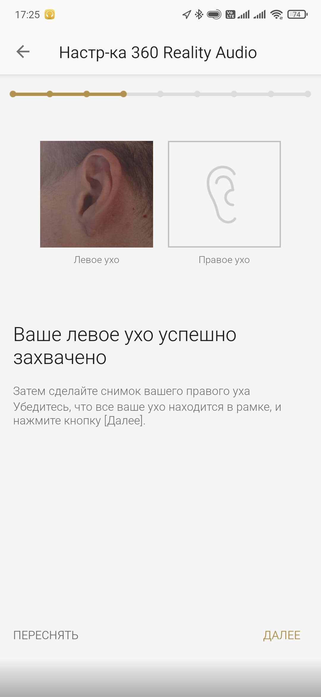 Вместо этого оно рапортует об окончании настройки, после чего предлагает продолжить настройку. Видимо, это такой переход на новый уровень — один пройден, остался еще один. На нем нам предстоит окончательно довести до ума работу 360 Reality Audio. А для этого надо сфотографировать уши — такие дела.
